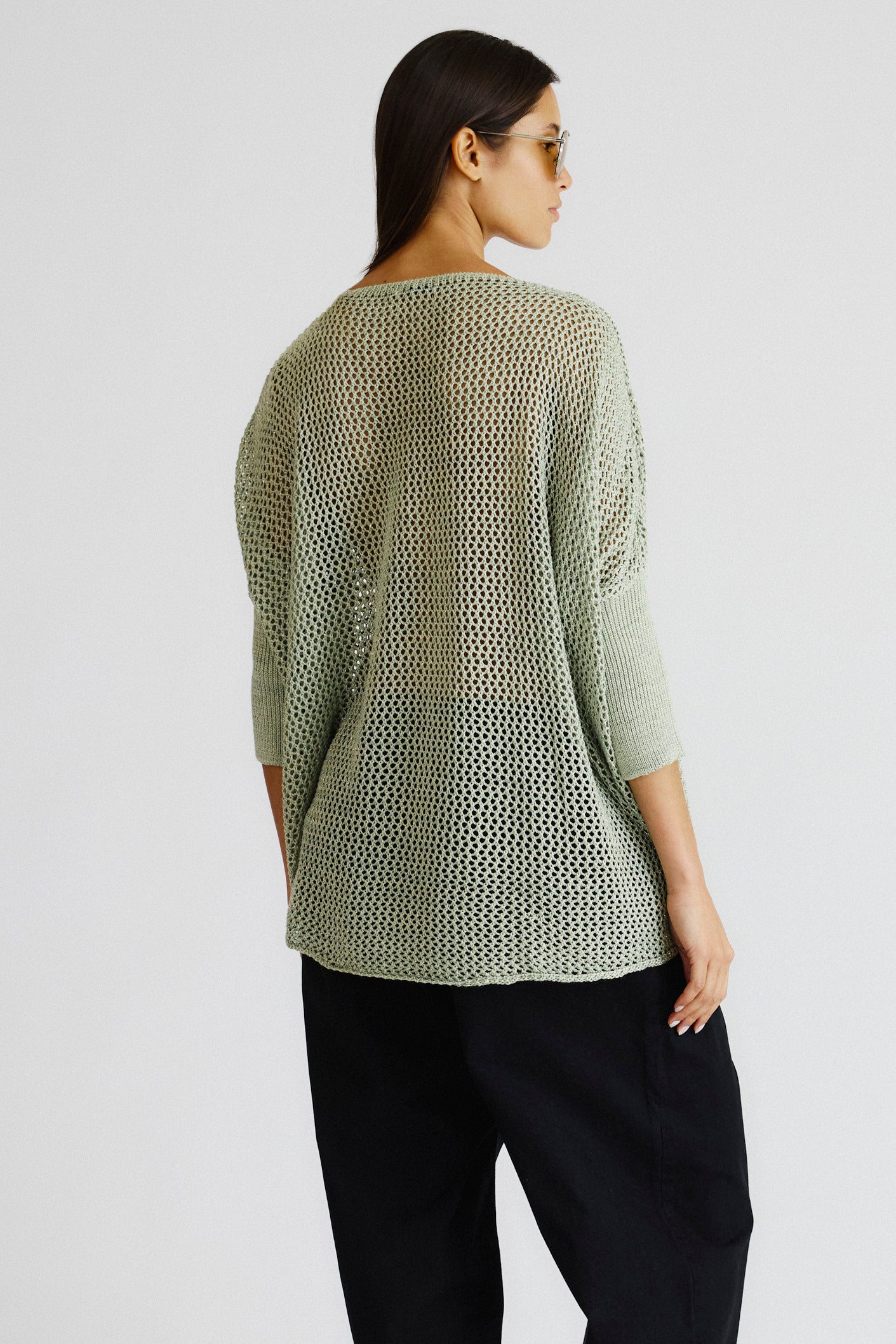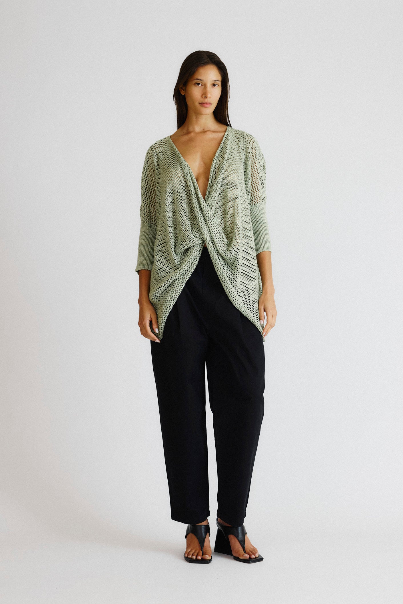Blusa em tricot leve com ponto aberto e caimento solto. Possui manga 3/4, decote profundo em V e detalhe frontal cruzado que forma um drapeado natural.