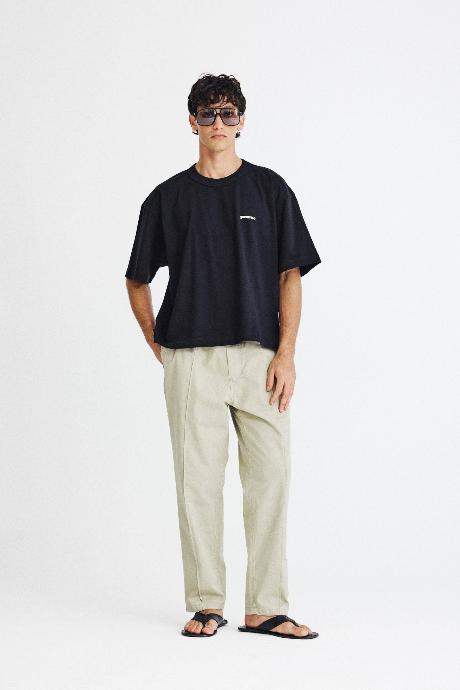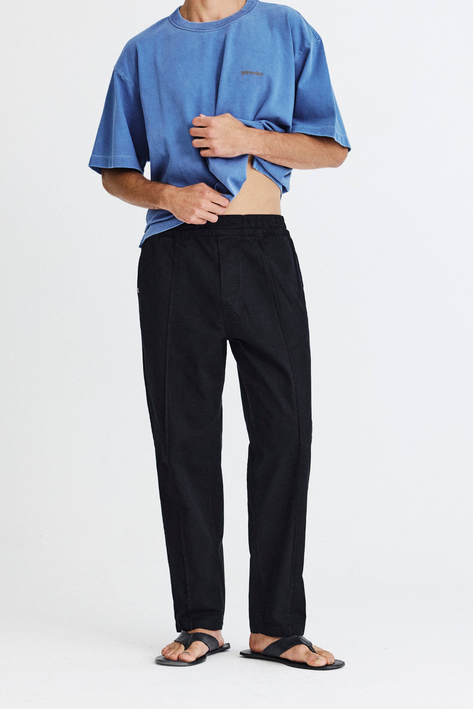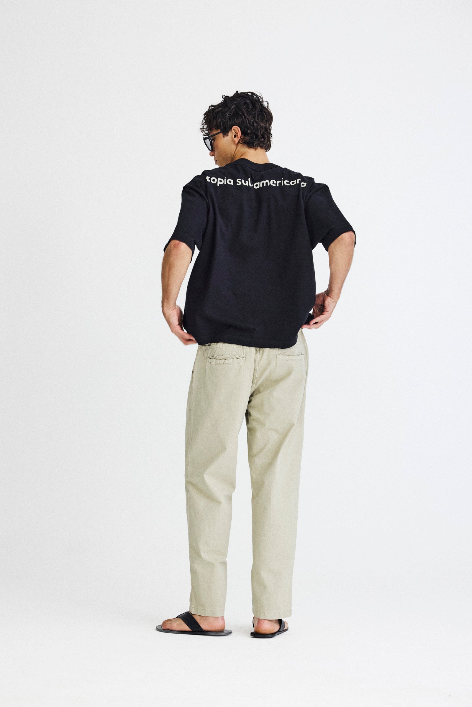 Calça reta em sarja, com friso frontal. Possui cós com elástico, garantindo ajuste confortável e bolsos laterais. Nas costas, conta com bolsos embutidos, mantendo o visual limpo e funcional. Peça prática para o dia a dia.