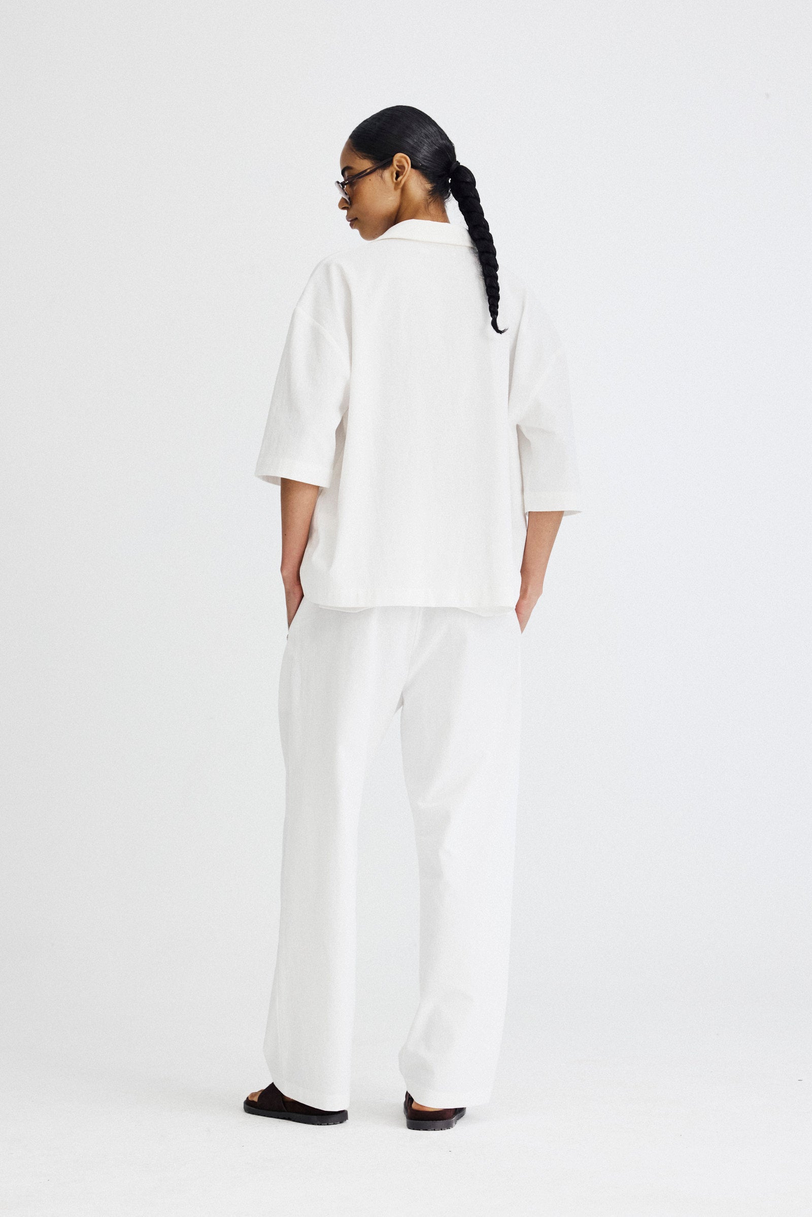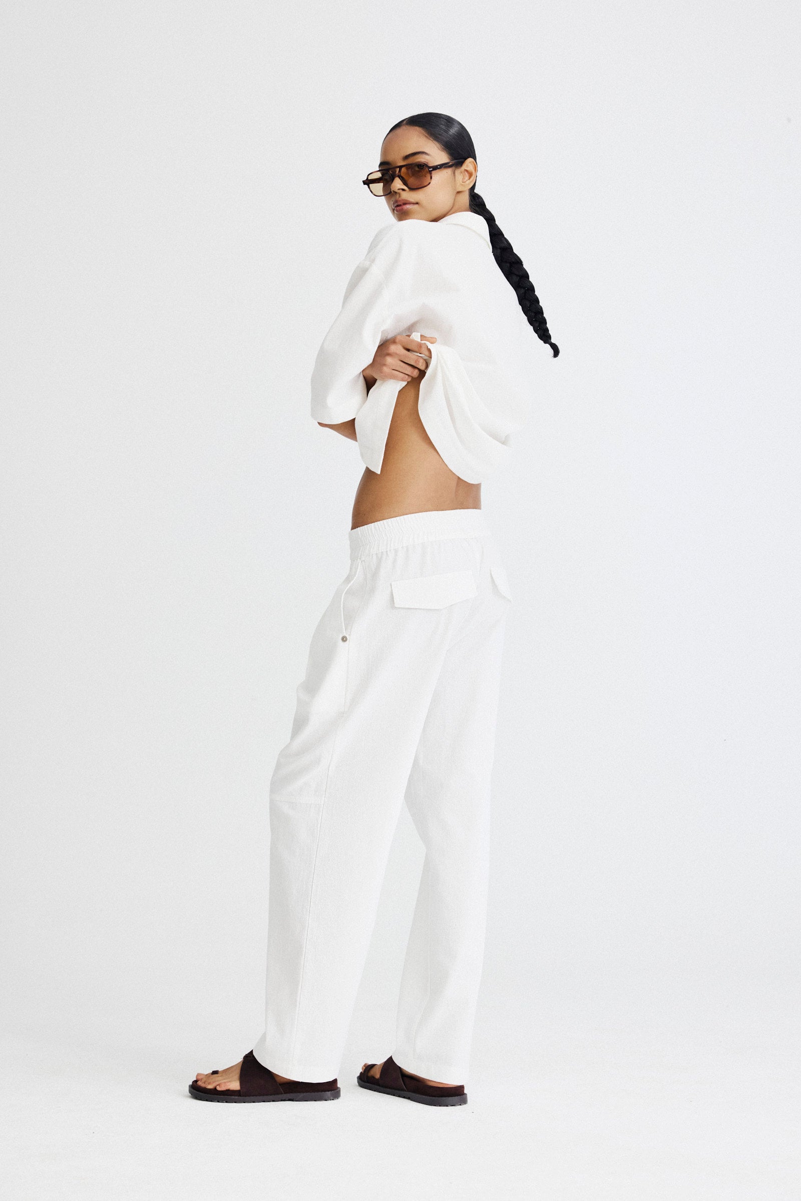 Calça reta em algodão com caimento amplo. O cós é totalmente elástico, garantindo ajuste prático sem perder o visual limpo. Traz bolsos embutidos nas laterais, discretos e funcionais, além de um recorte horizontal na perna.