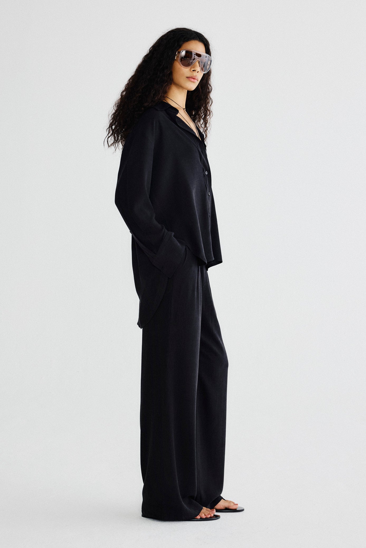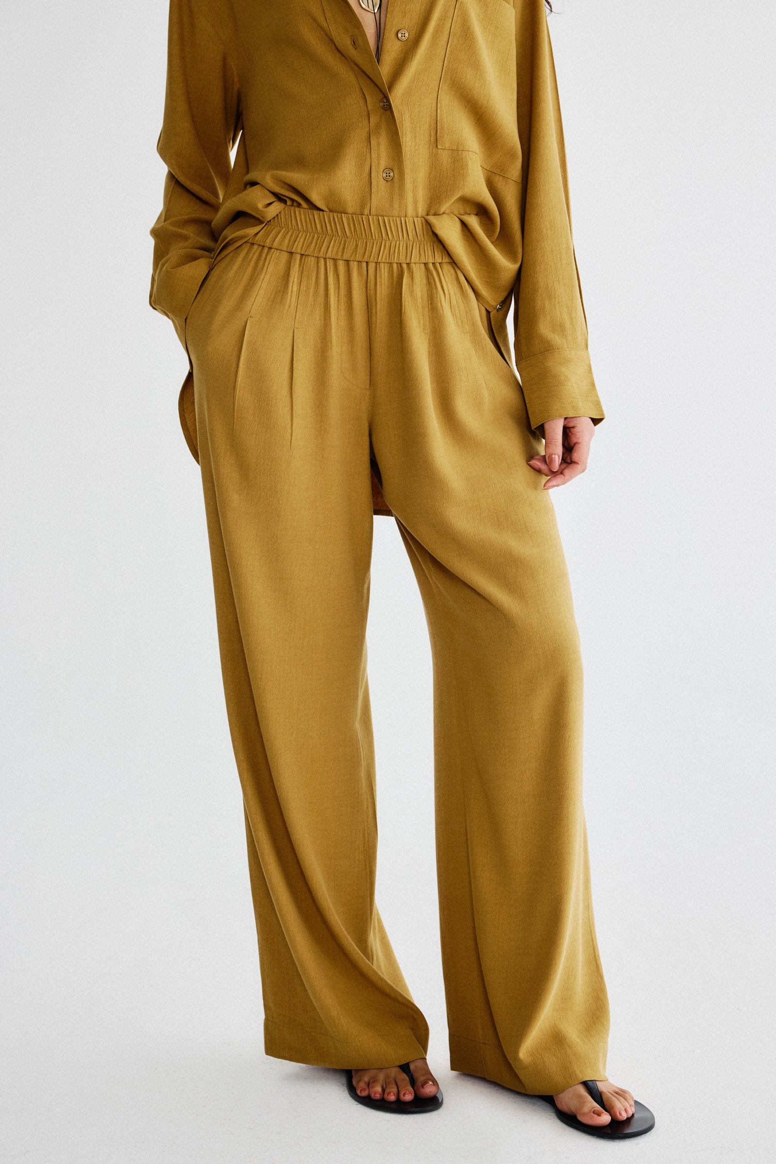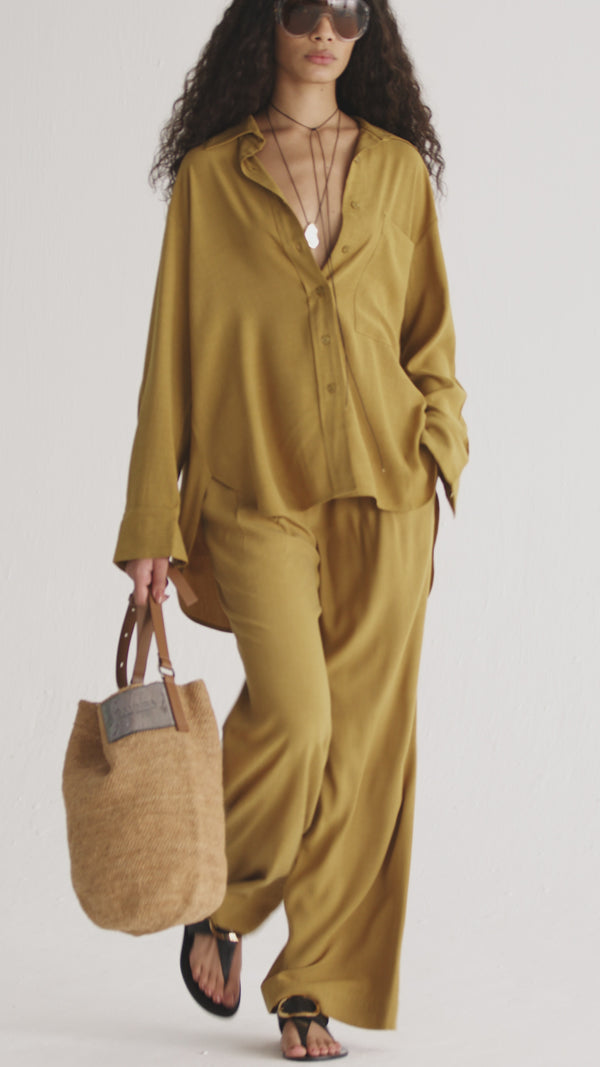 Calça reta leve, de liocel suave ao toque. Possui comprimento alongado, cós de elástico, bolsos embutidos nas laterais. Desenvolvimento e produção 100% nacional.