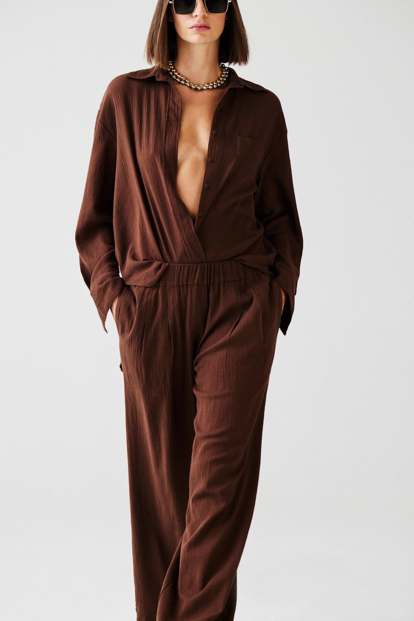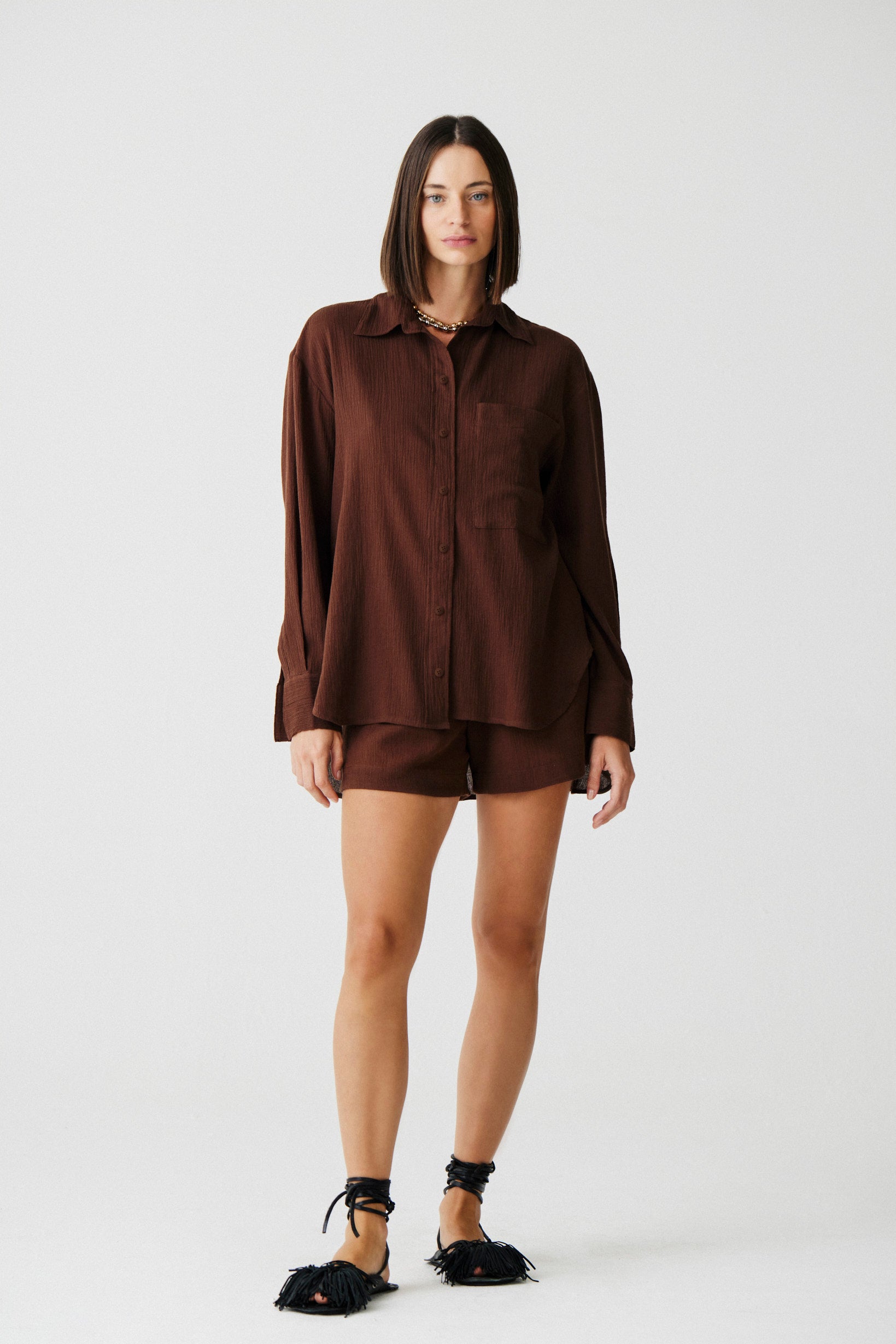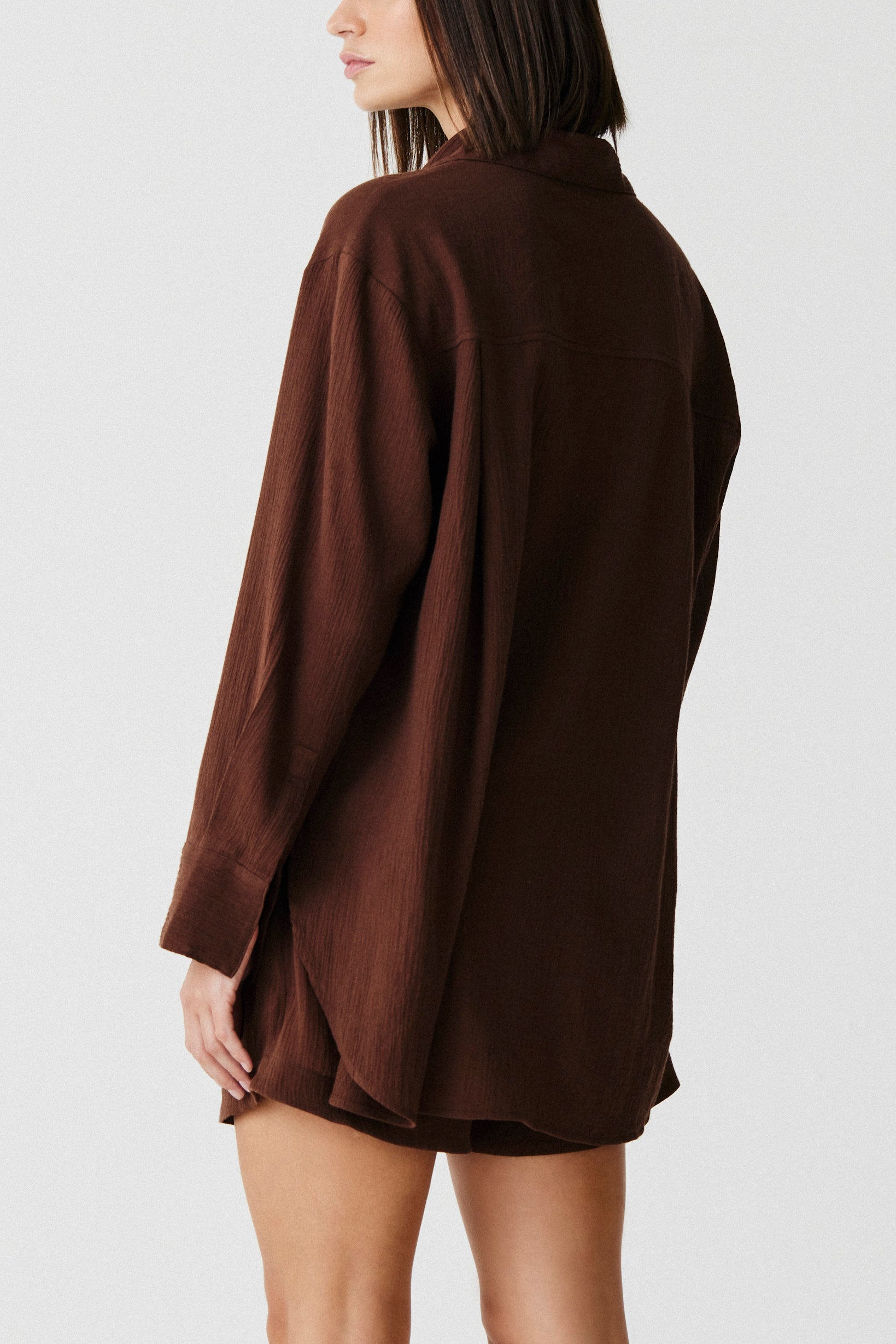 Camisa de alfaiataria clássica em um tecido leve de algodão rústico. Possui a parte de trás mais comprida trazendo mais movimento e conforto.
