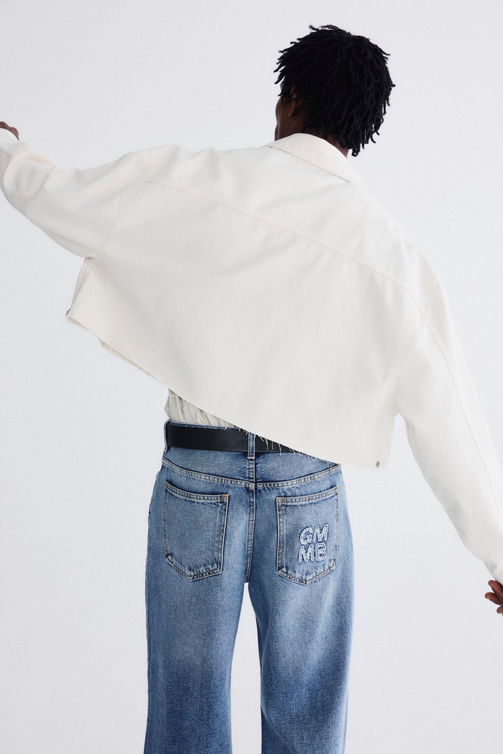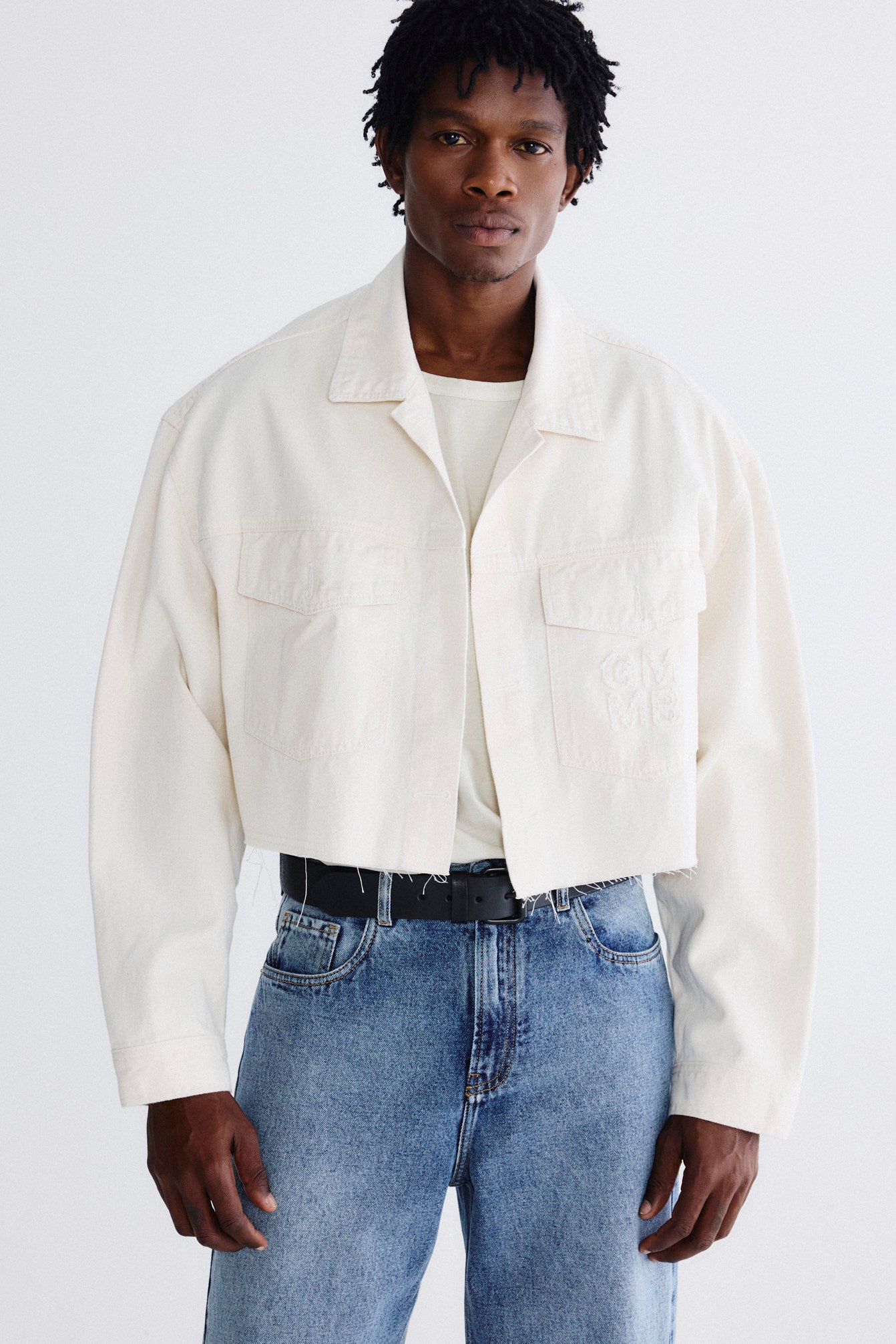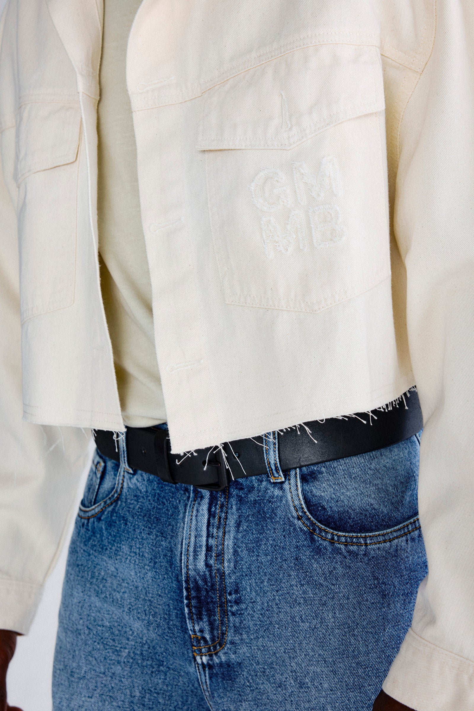 Jaqueta oversized curta com off-white e bordado aplicado no bolso frontal. Nosso jeans possui selo de produção ética, que respeita o trabalhador e preza pelo cuidado ao meio ambiente, utilizando técnicas que reduzem o consumo de água na produção.