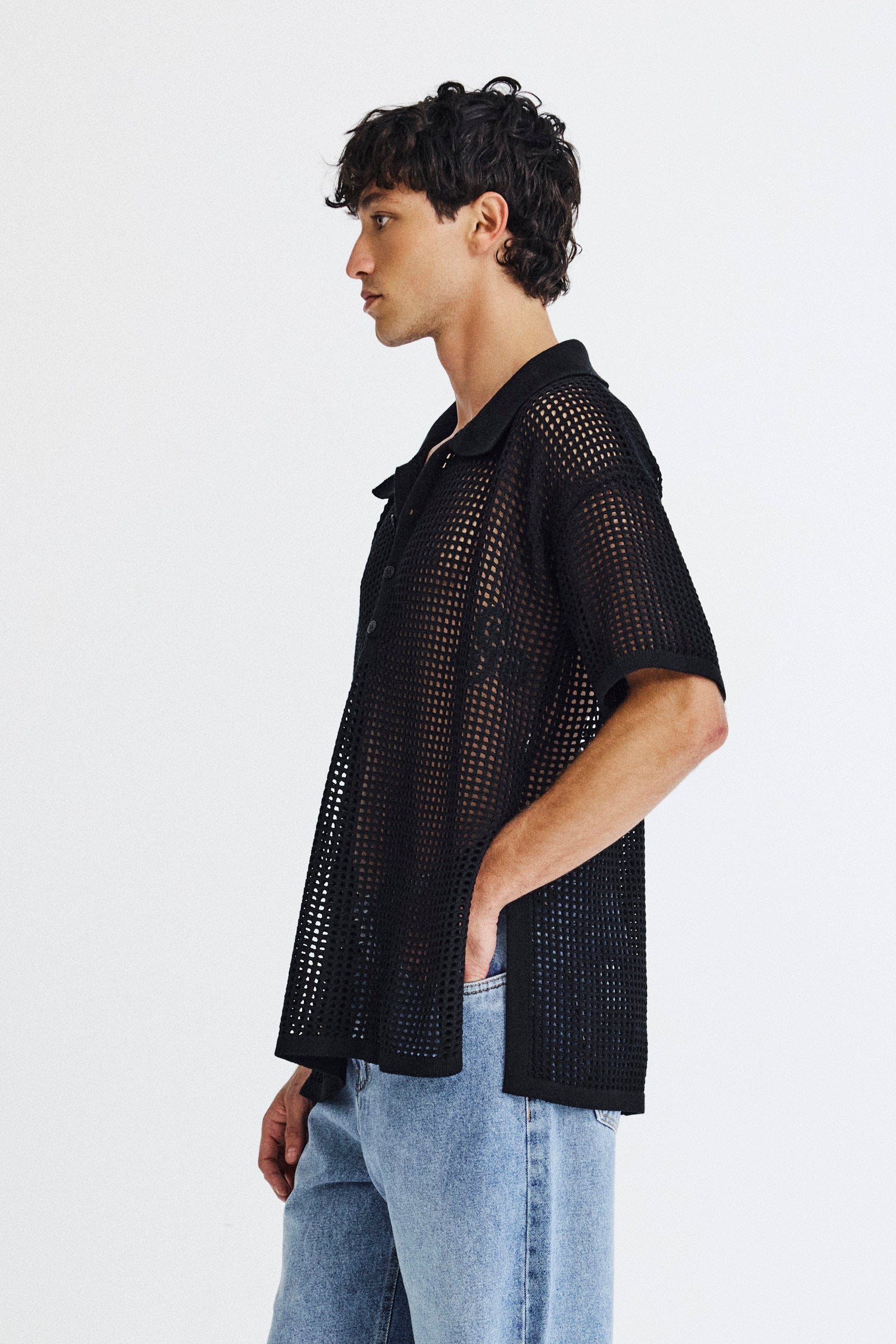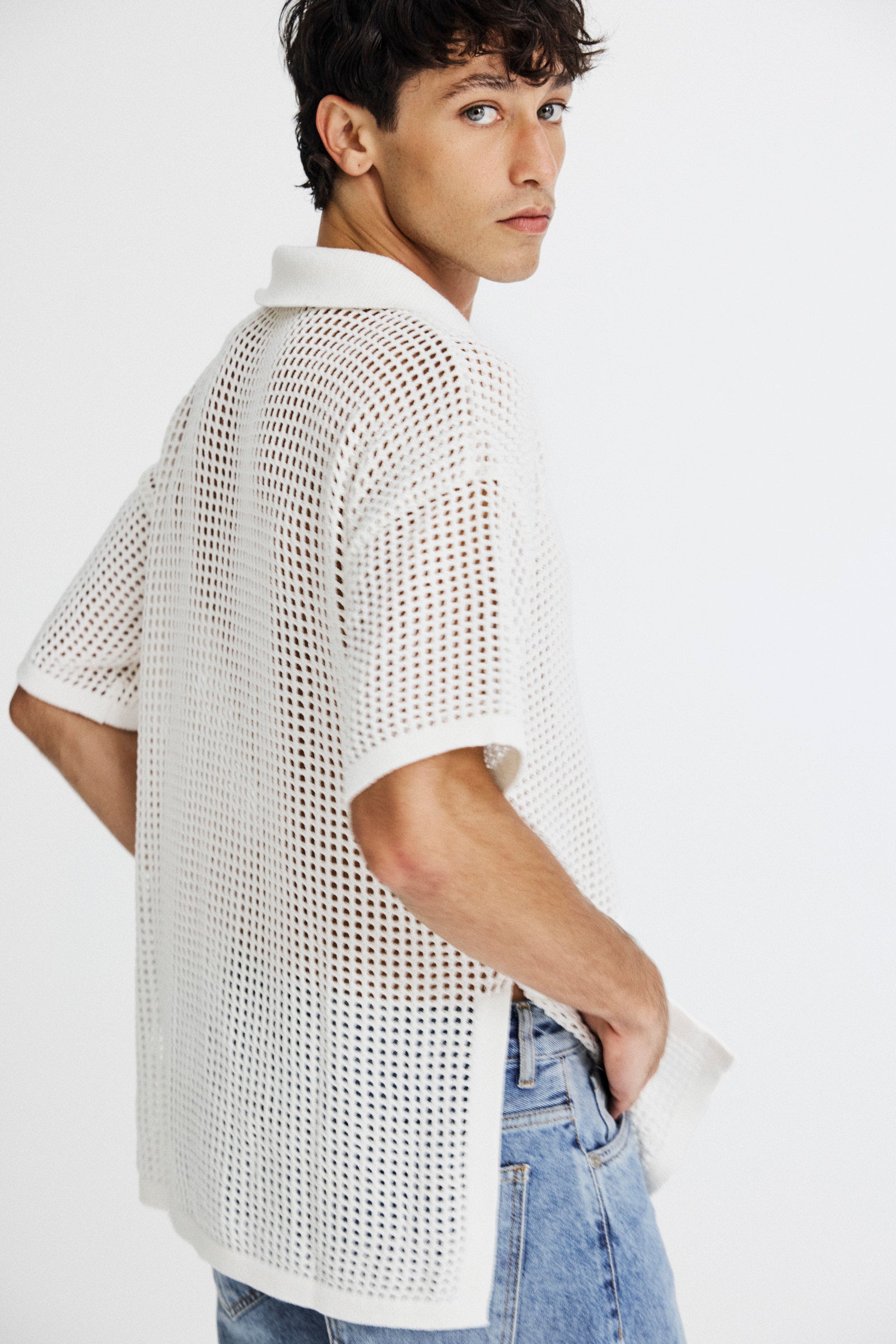 Camisa polo em ponto vazado, possui gola com fechamento frontal por botões e mangas curtas.A barra conta com fendas laterais para melhor caimento.