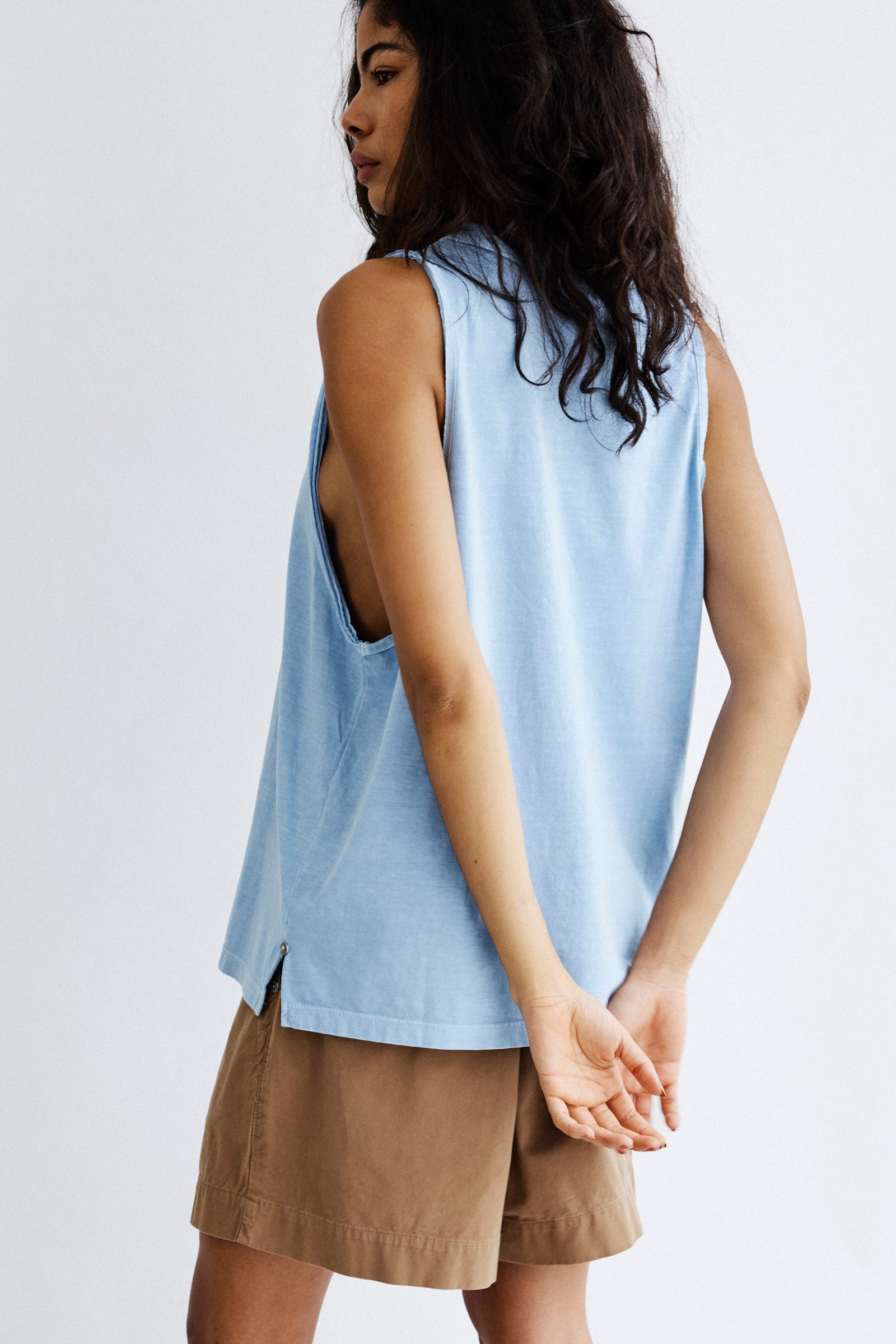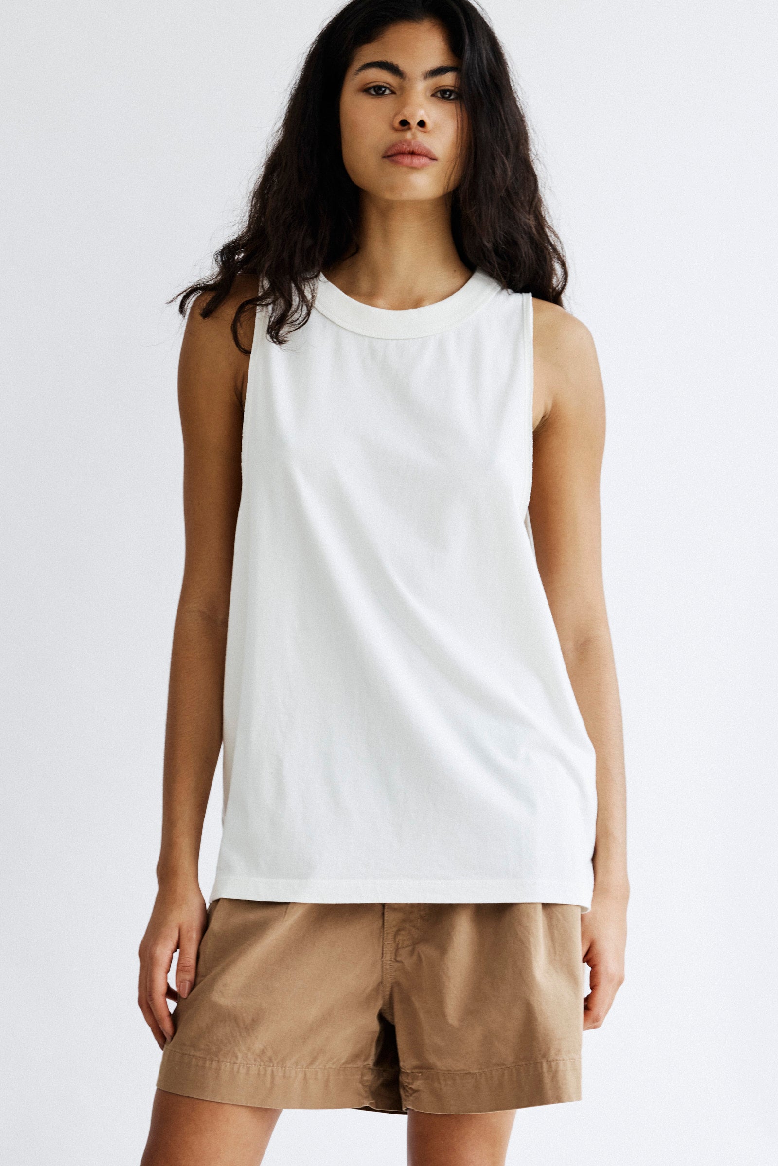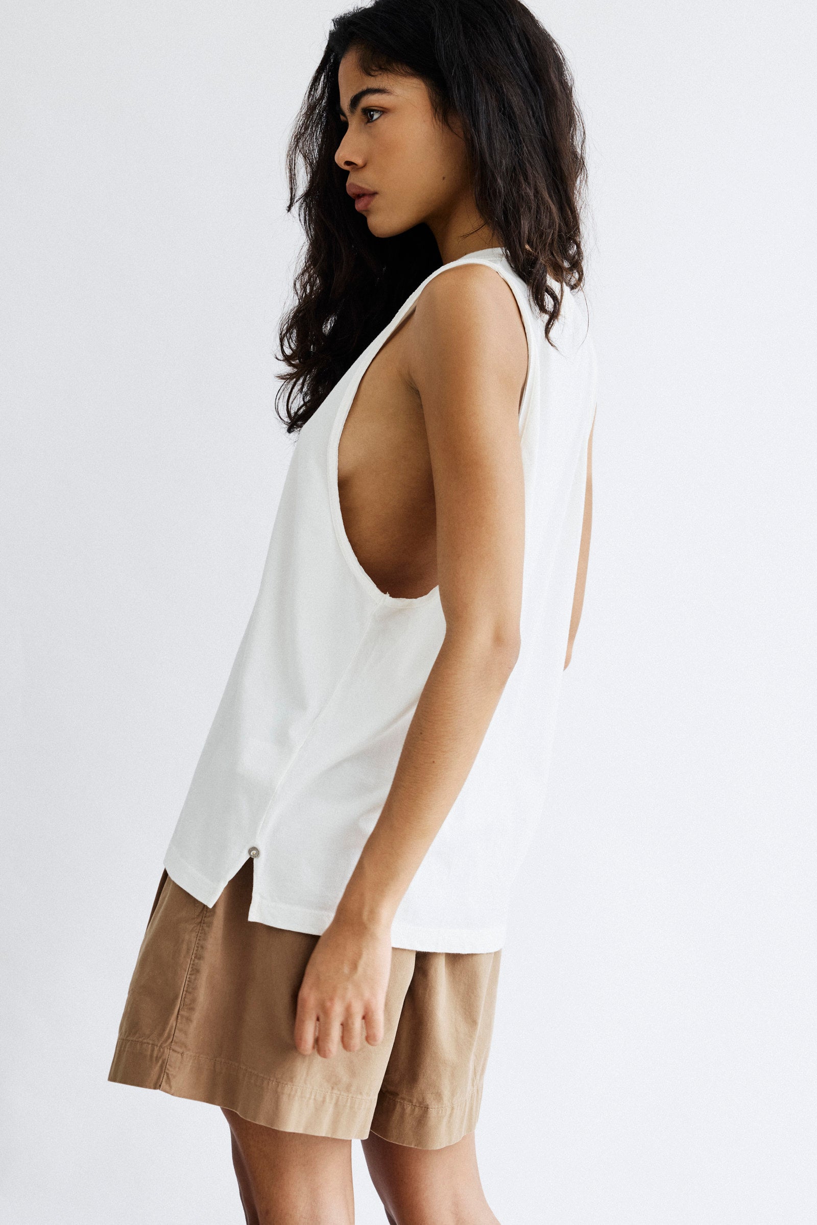 Regata feita em malhão de 270 g, com estrutura mais encorpada e toque firme. O modelo é cavado, trazendo laterais amplas que garantem uma silhueta mais despojada. Possui fendas laterais que ajudam no caimento e dão leve abertura na barra. A gola é finalizada em ribana, trazendo estabilidade e um acabamento limpo ao redor do decote.