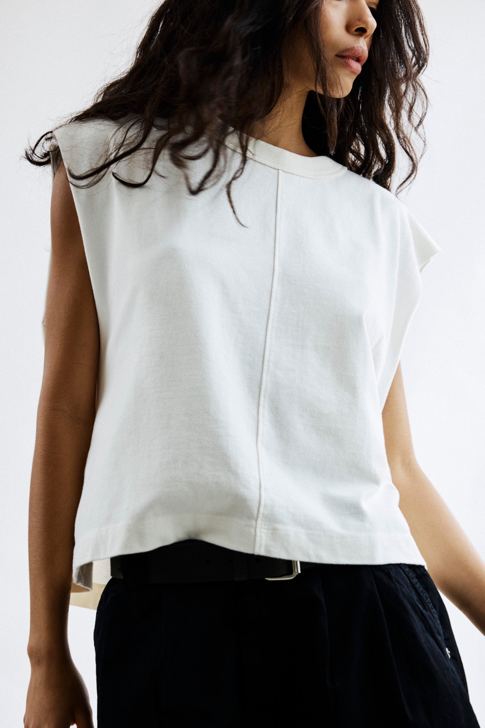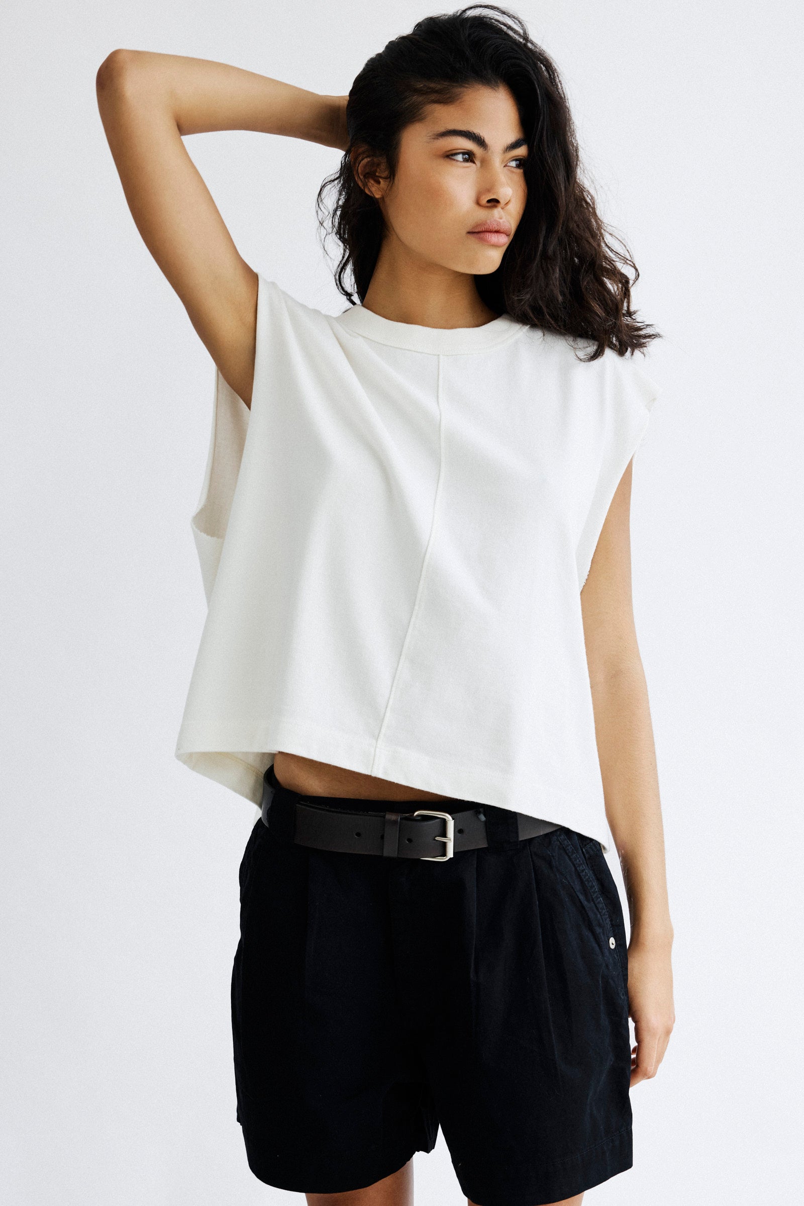 Regata machão cropped feita em malhão 270 g, com recorte frontal. Modelagem cavada, barra reta e gola em ribana que mantém a estrutura. O tecido encorpado traz firmeza ao vestir sem perder o conforto.