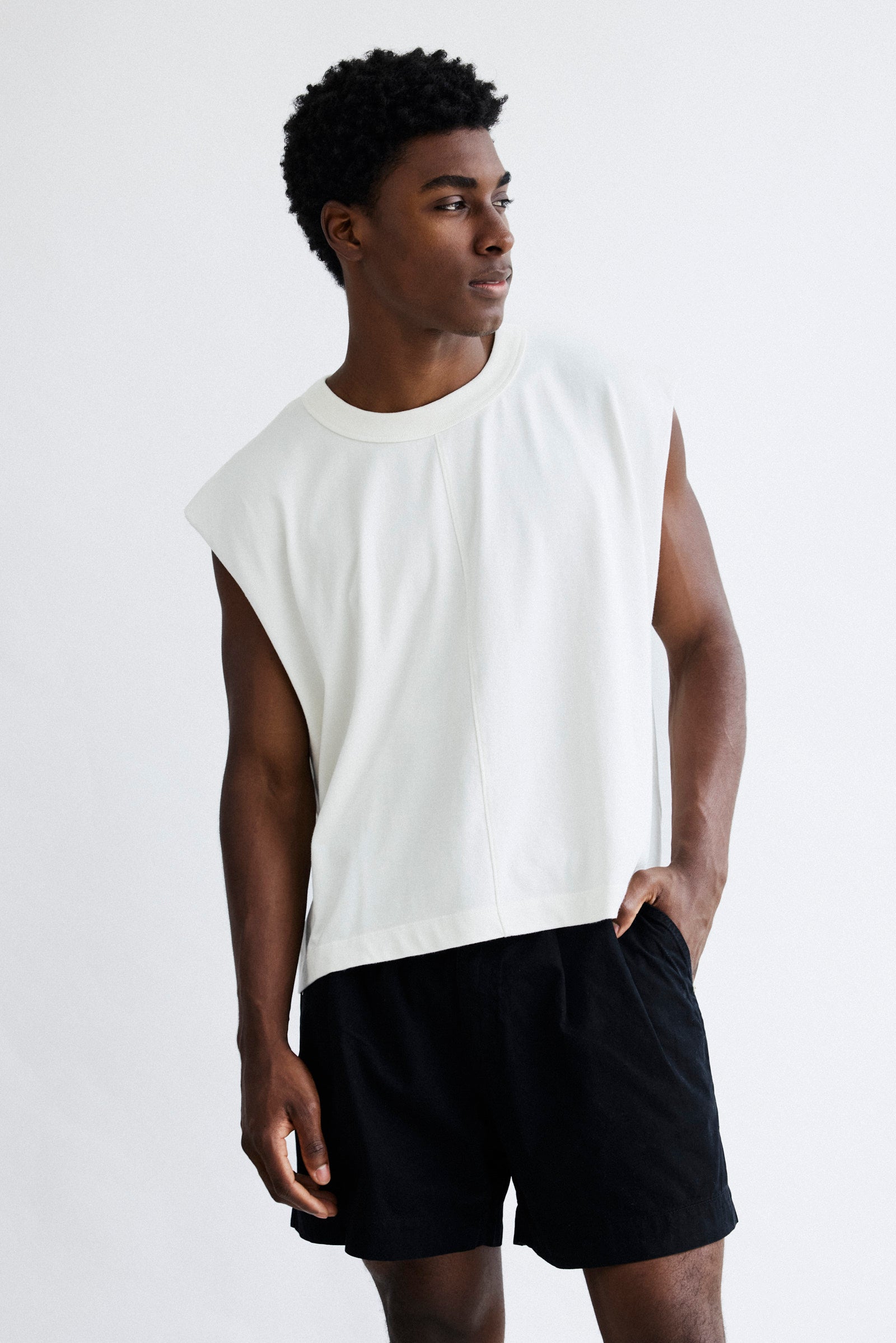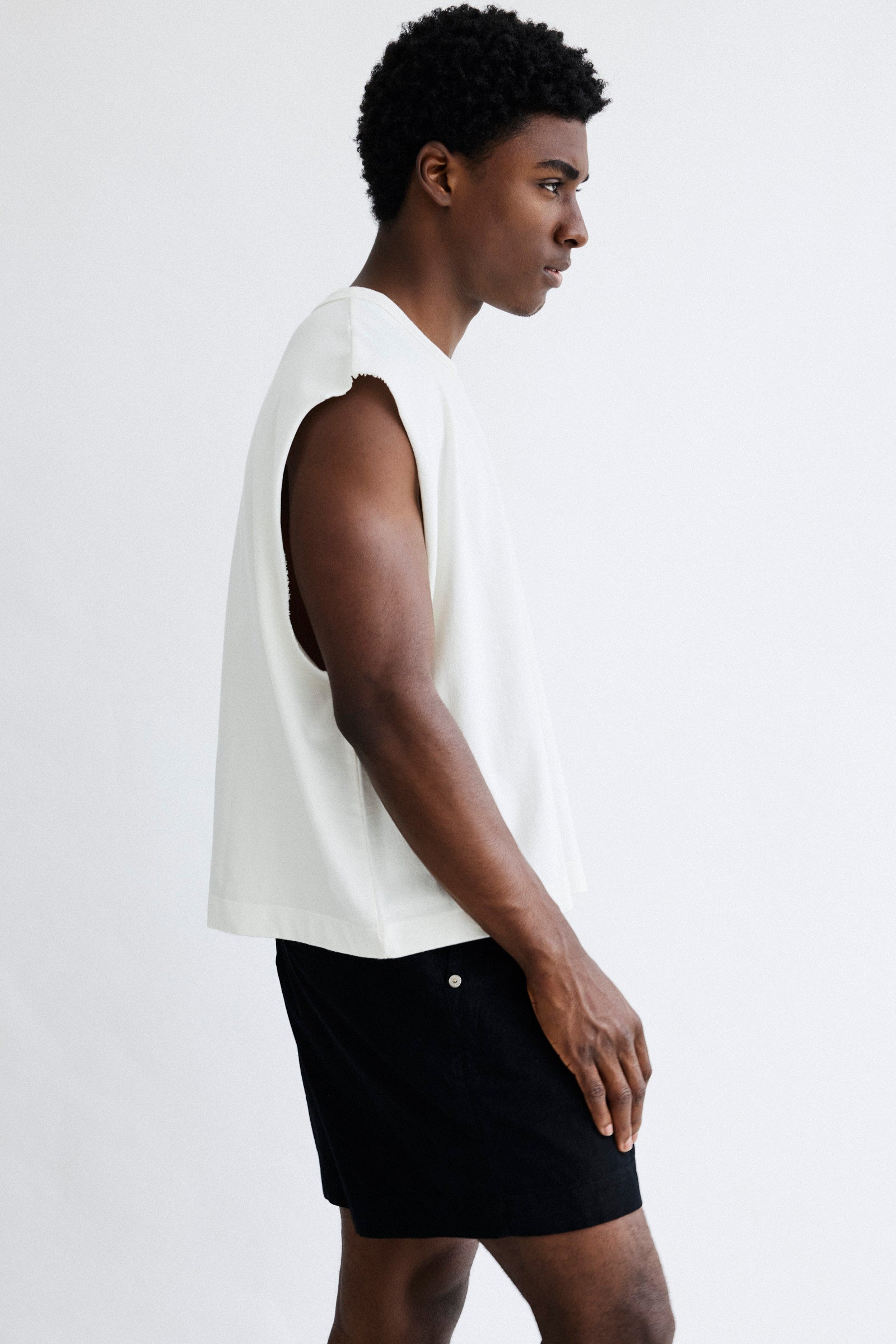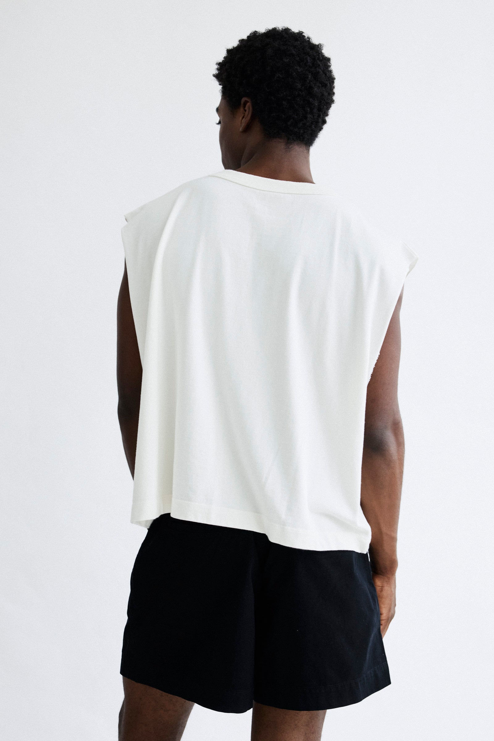 Regata machão cropped feita em malhão 270 g, com recorte frontal. Modelagem cavada, barra reta e gola em ribana que mantém a estrutura. O tecido encorpado traz firmeza ao vestir sem perder o conforto.