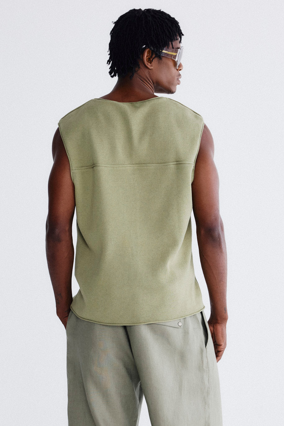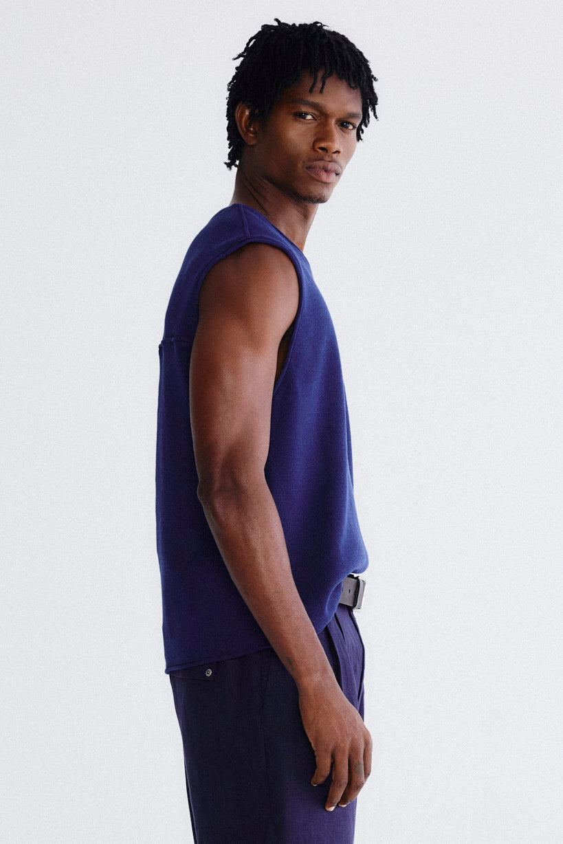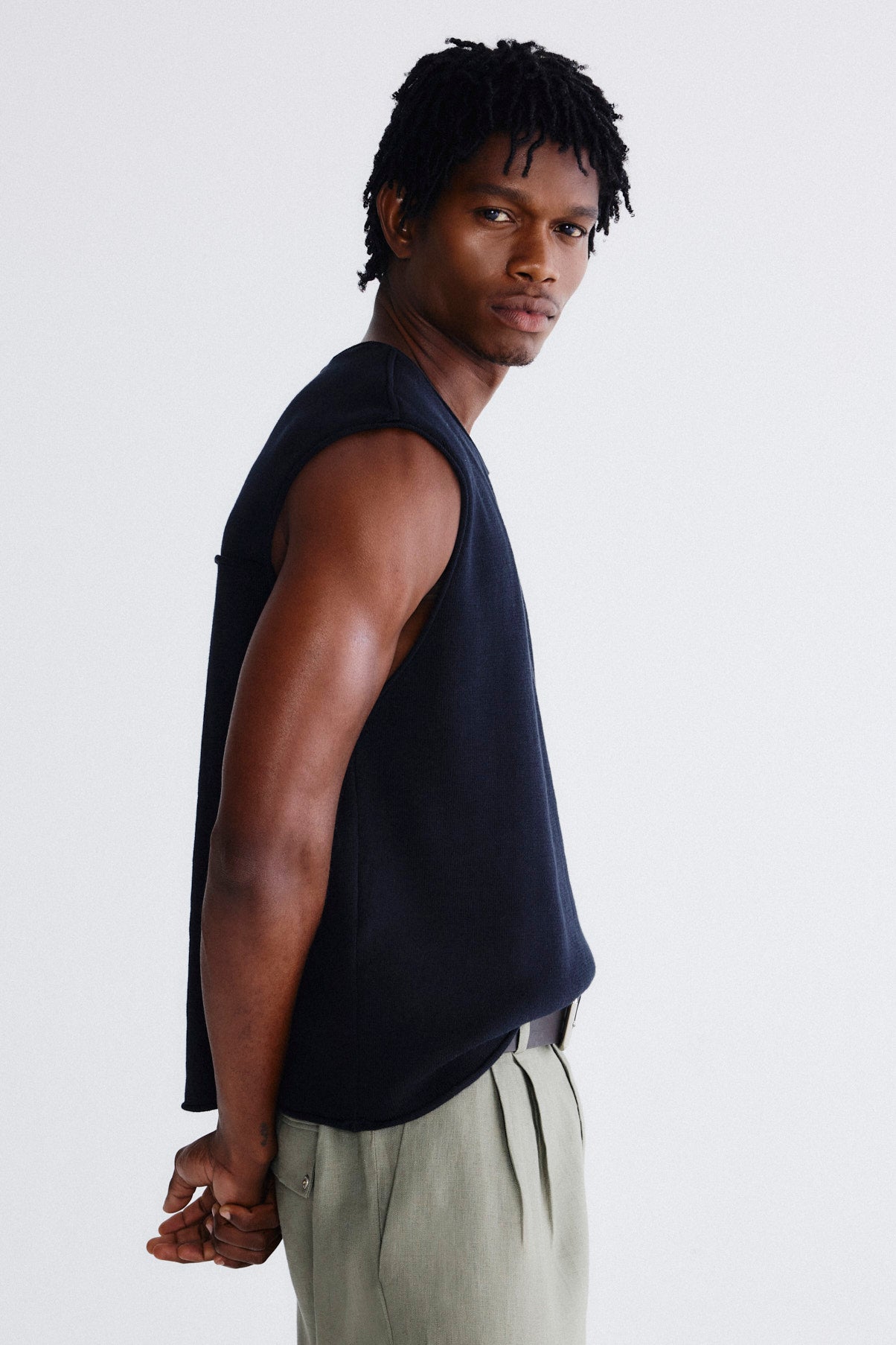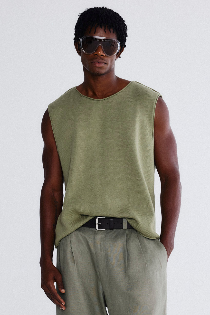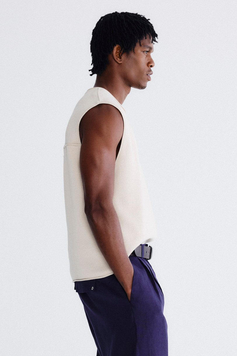 - Possui toque suave de tricot e modelagem reta com cava acentuada.