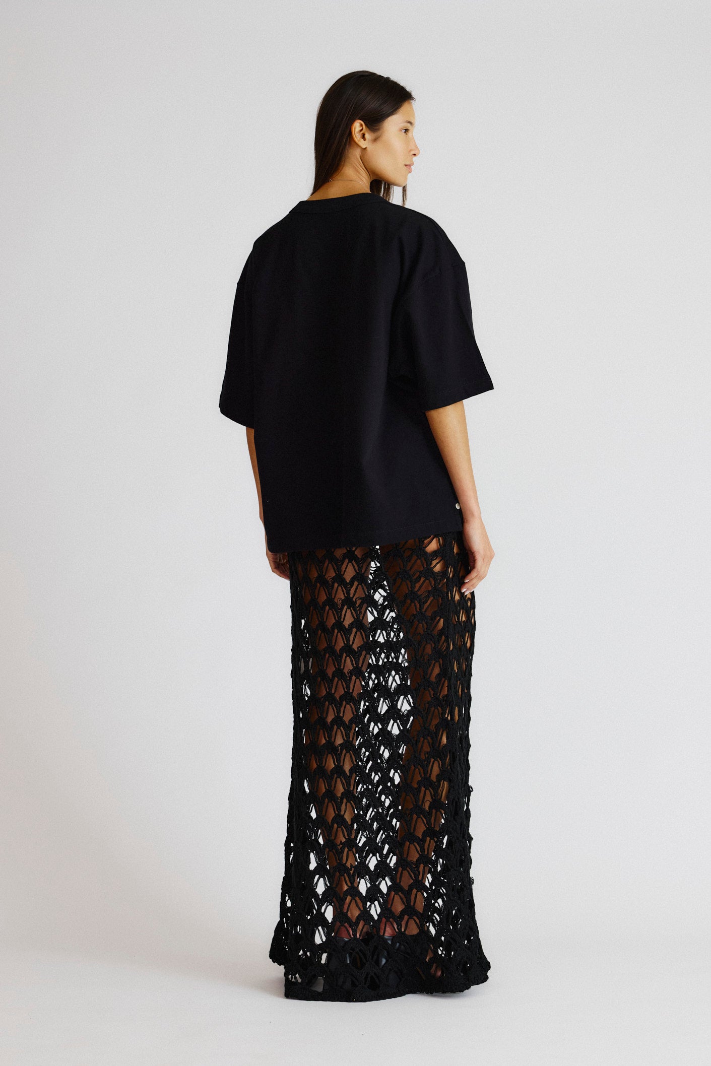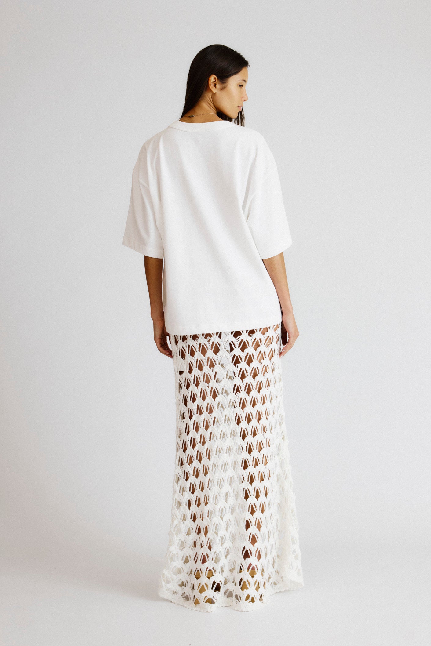Saia longa em tricot com trama vazada. Possui cós elástico e caimento leve, ideal para sobreposições ou produções casuais.