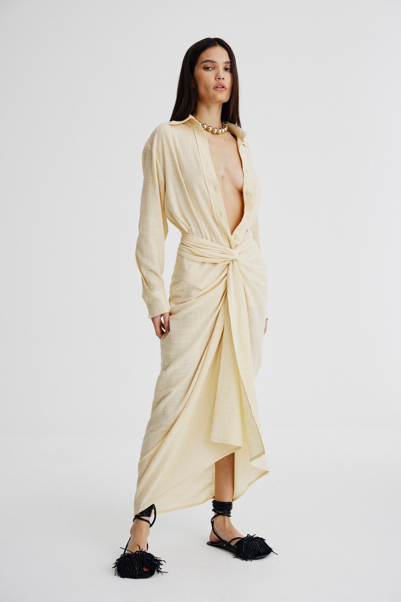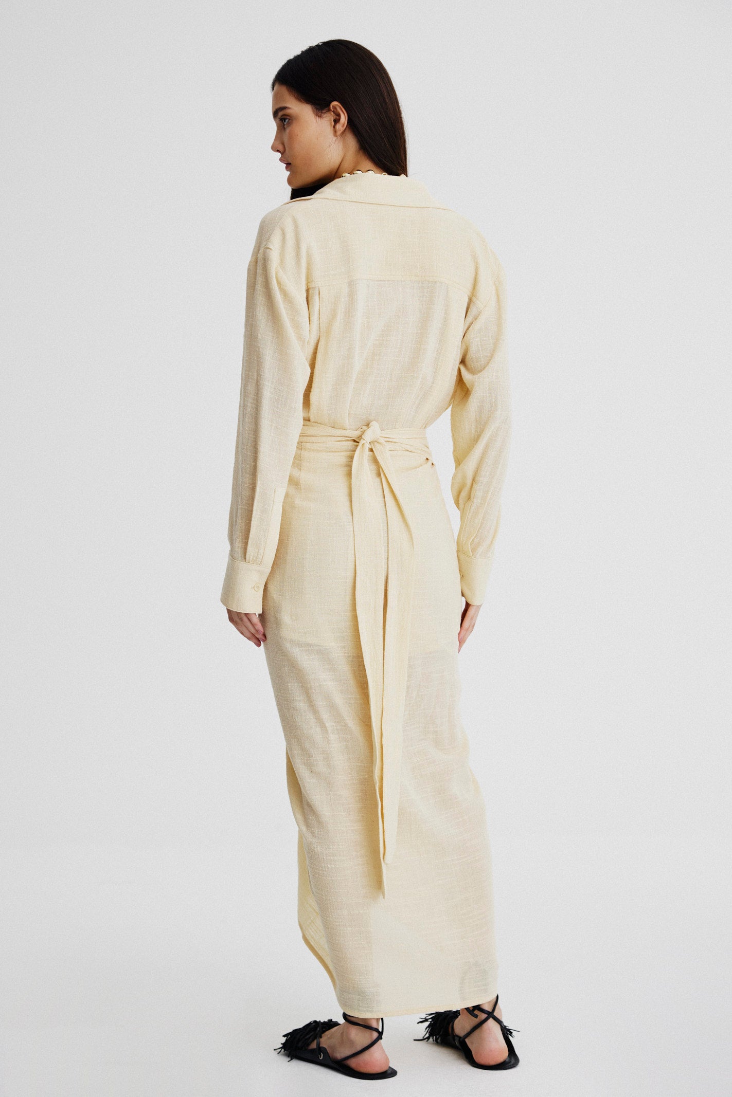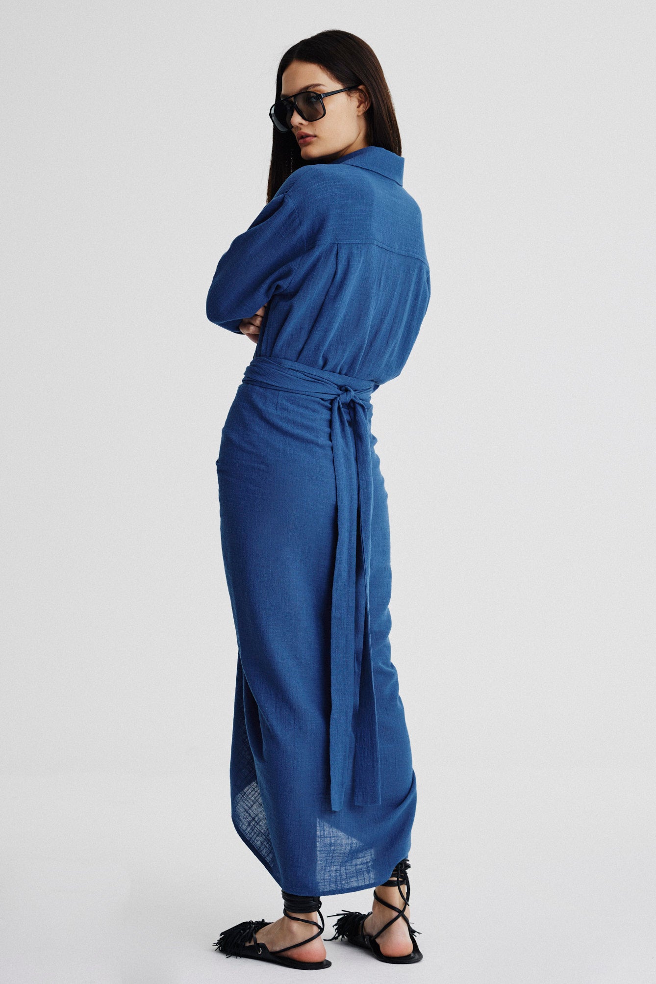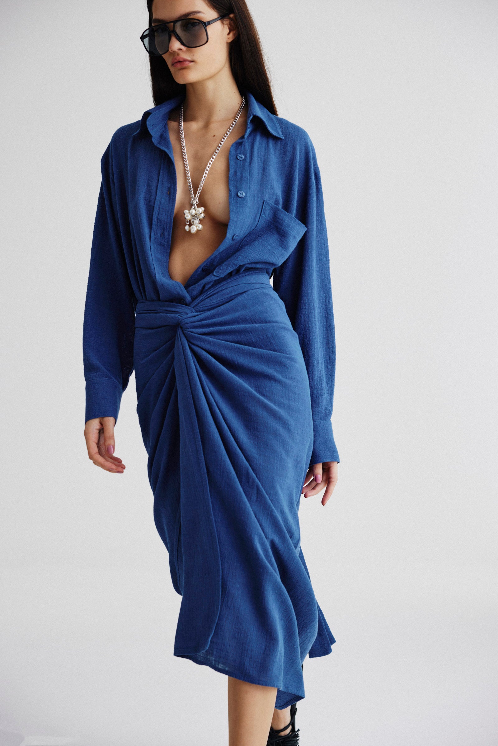 • Possui modelagem estilo pareô, comprimento midi, cintura alta e fechamento por amarração que pode ser feita de diversas formas.