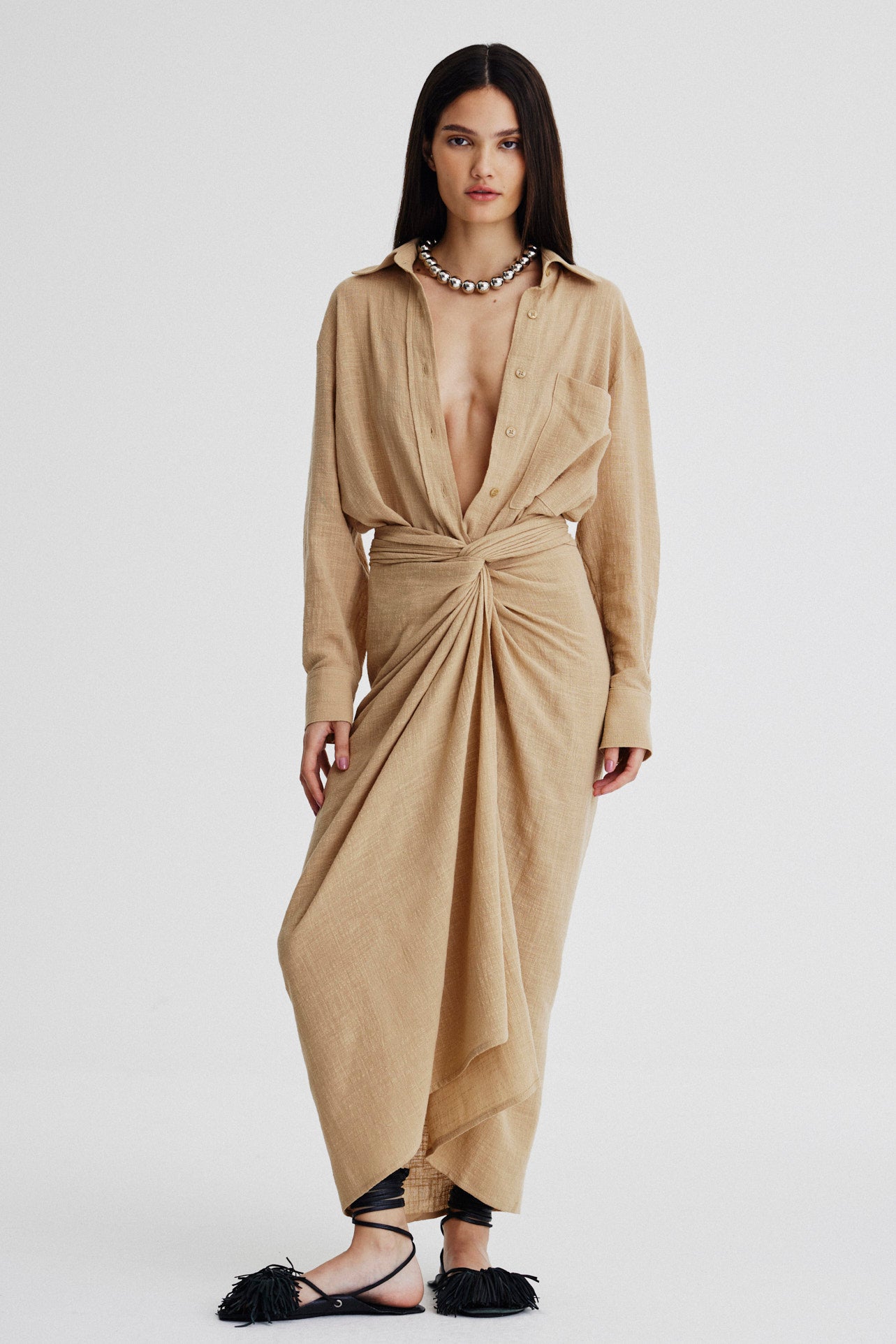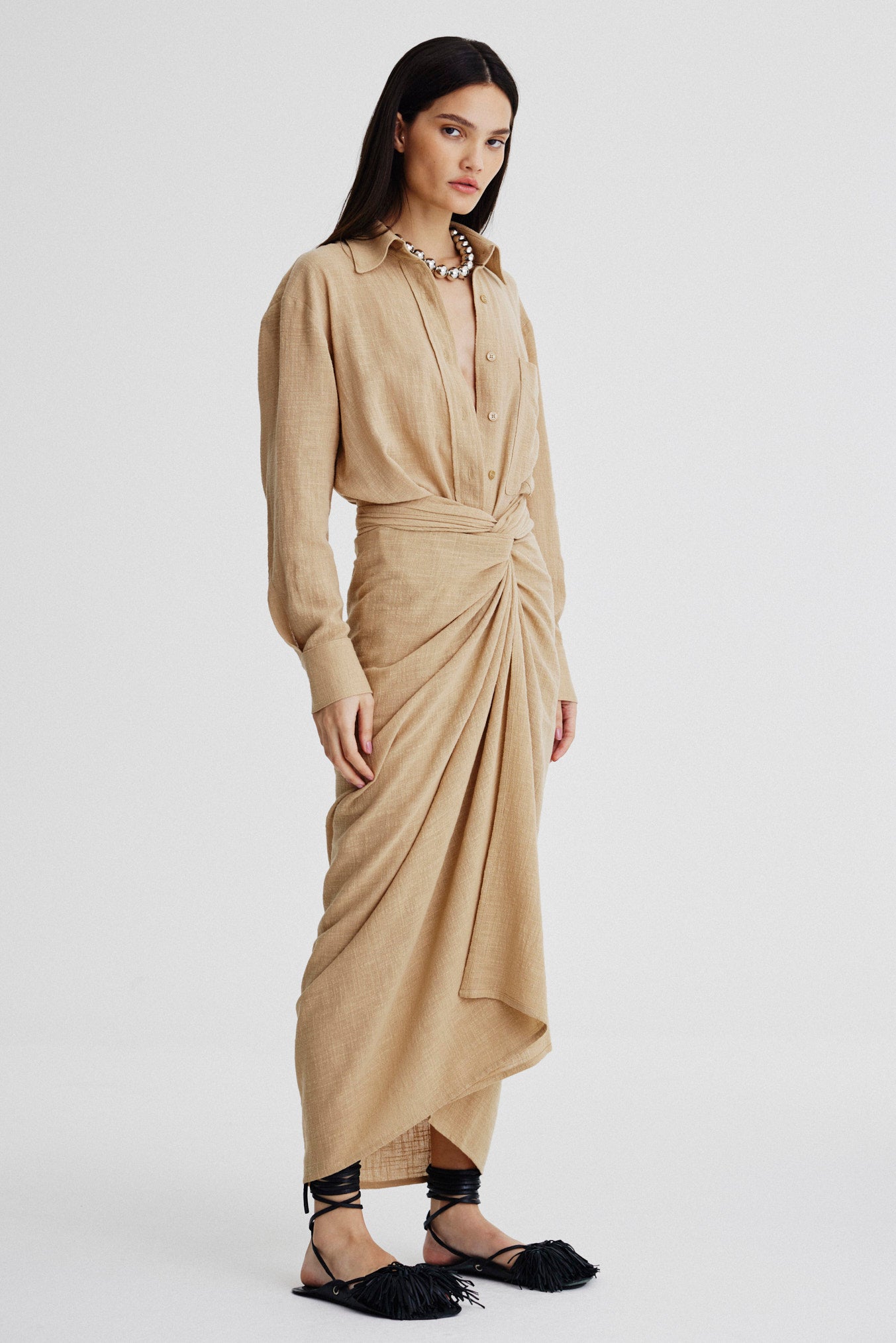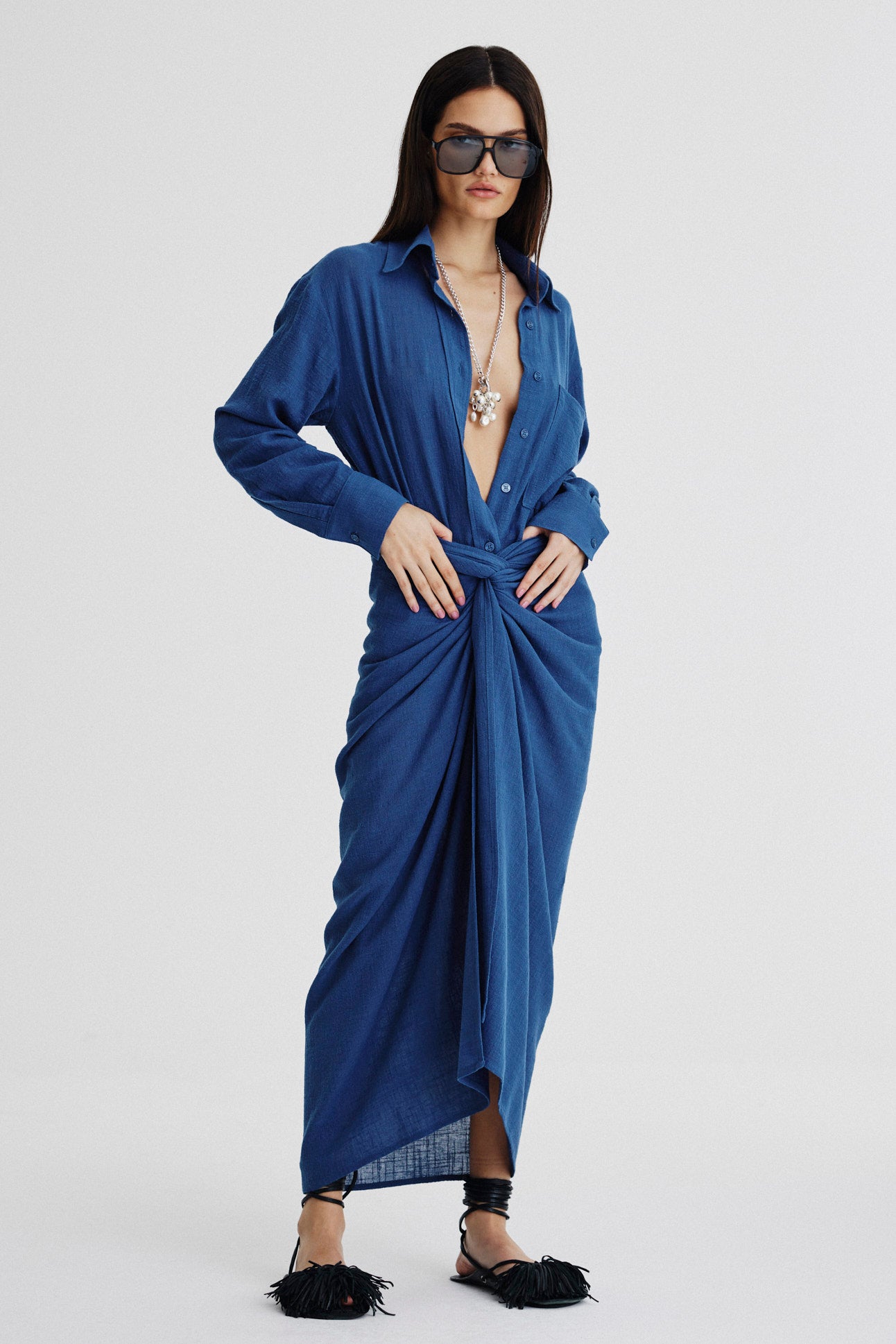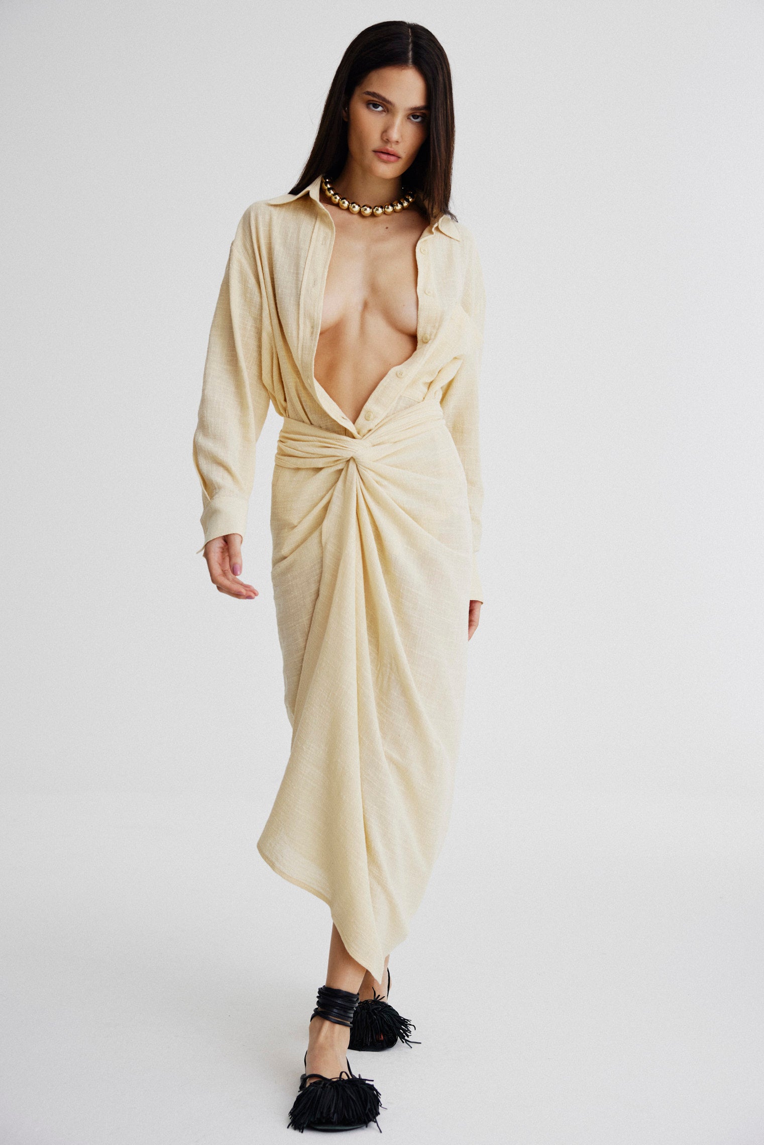 • Possui modelagem estilo pareô, comprimento midi, cintura alta e fechamento por amarração que pode ser feita de diversas formas.