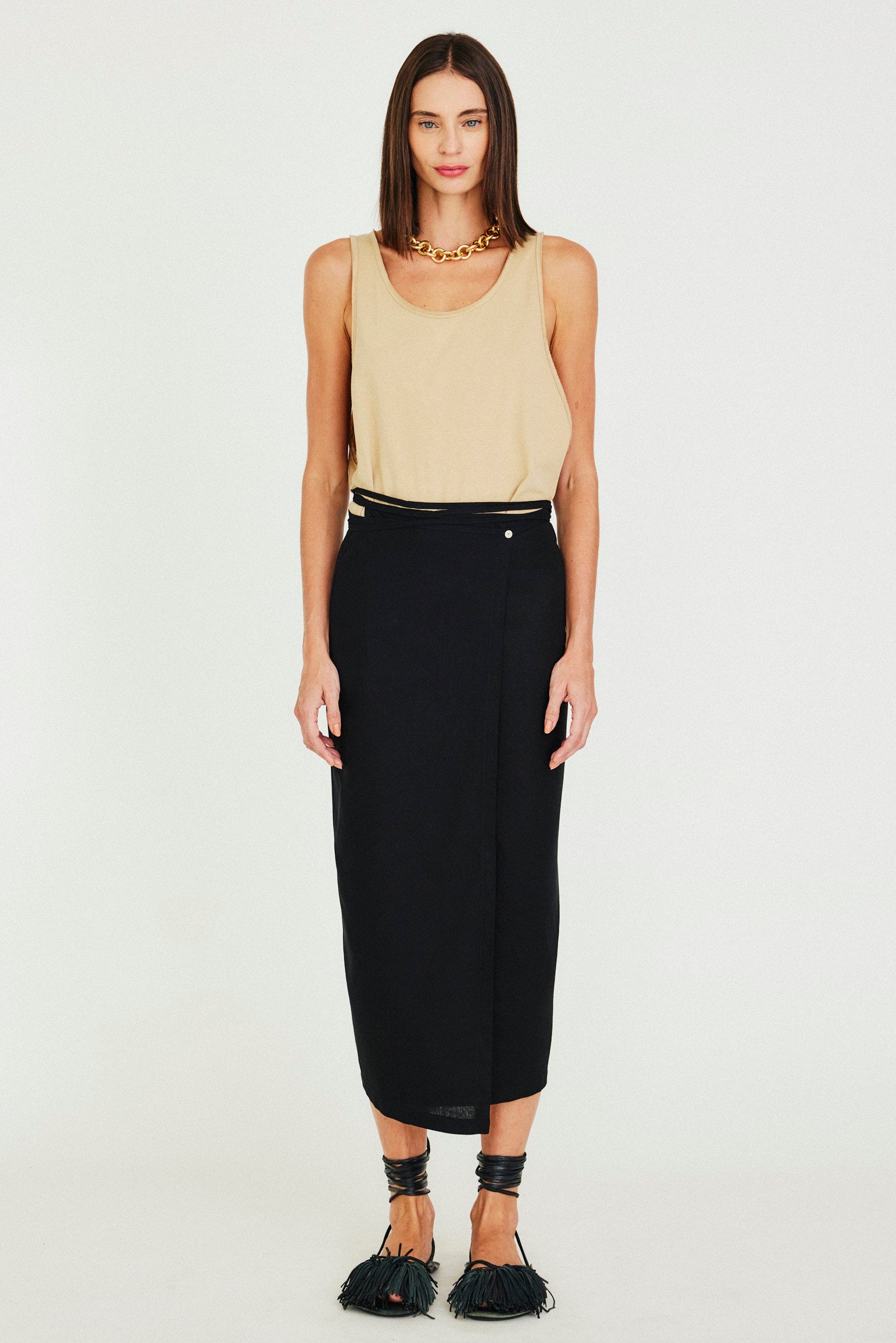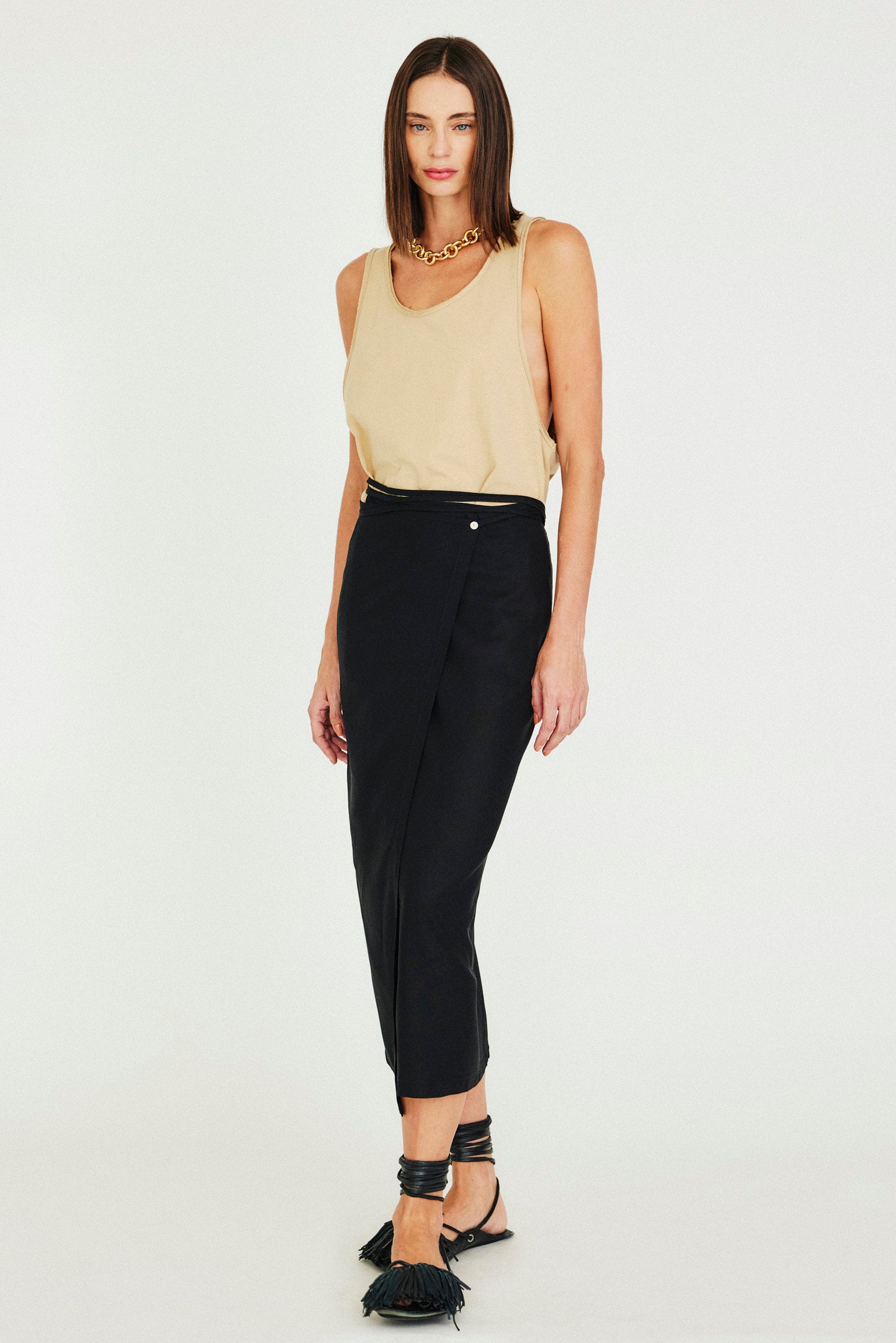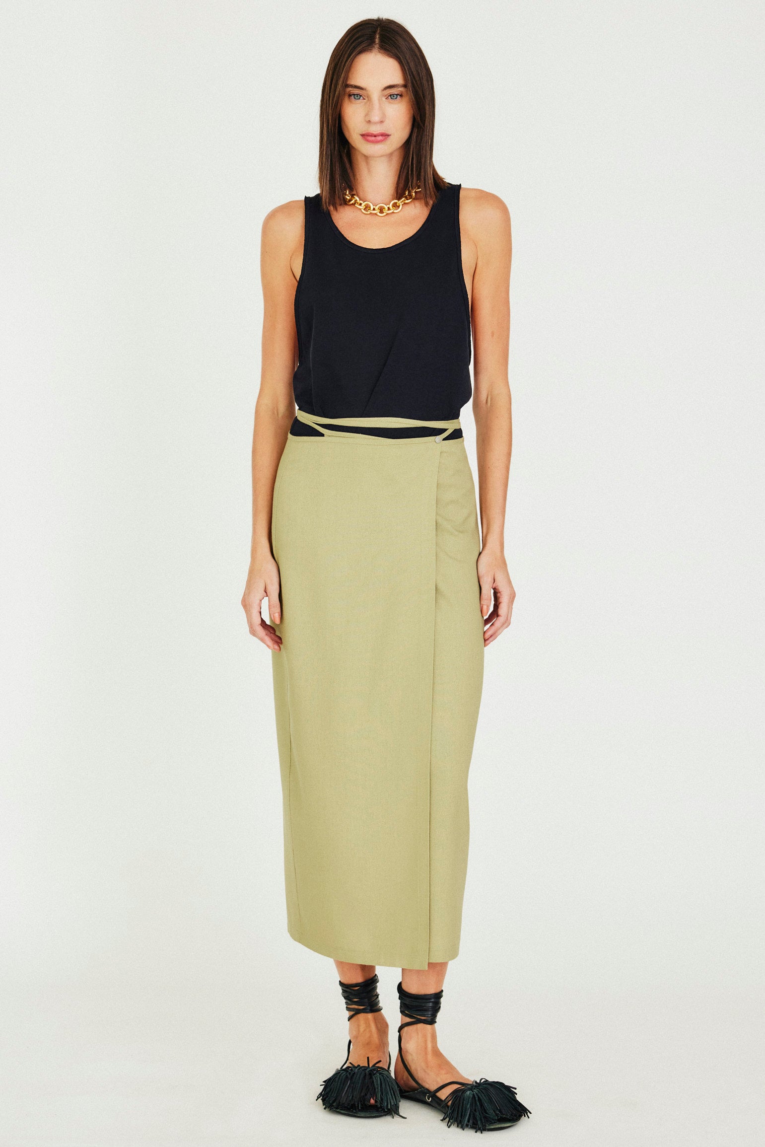 Saia pareo midi confeccionada em tecido leve e estruturado. Possui amarração lateral com tiras finas finalizada por ponteiras. Ideal para compor produções descomplicadas.  Desenvolvimento e produção 100% nacional.