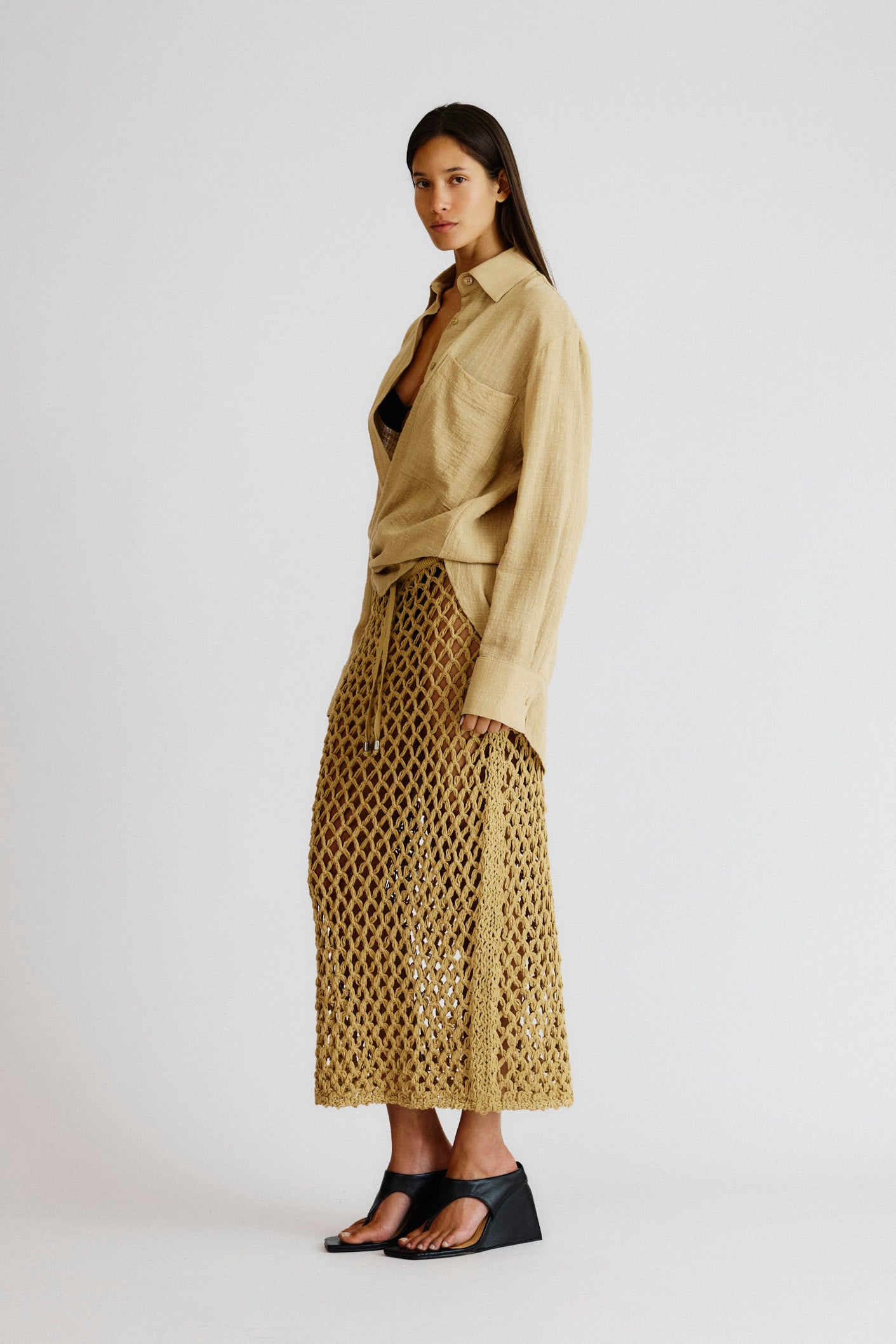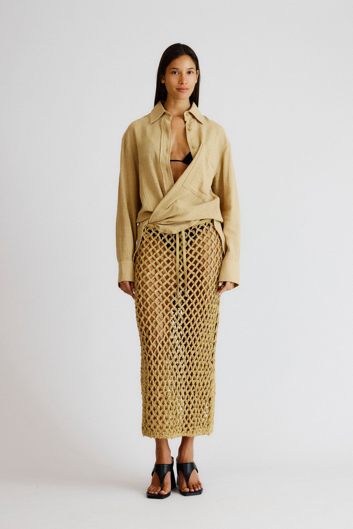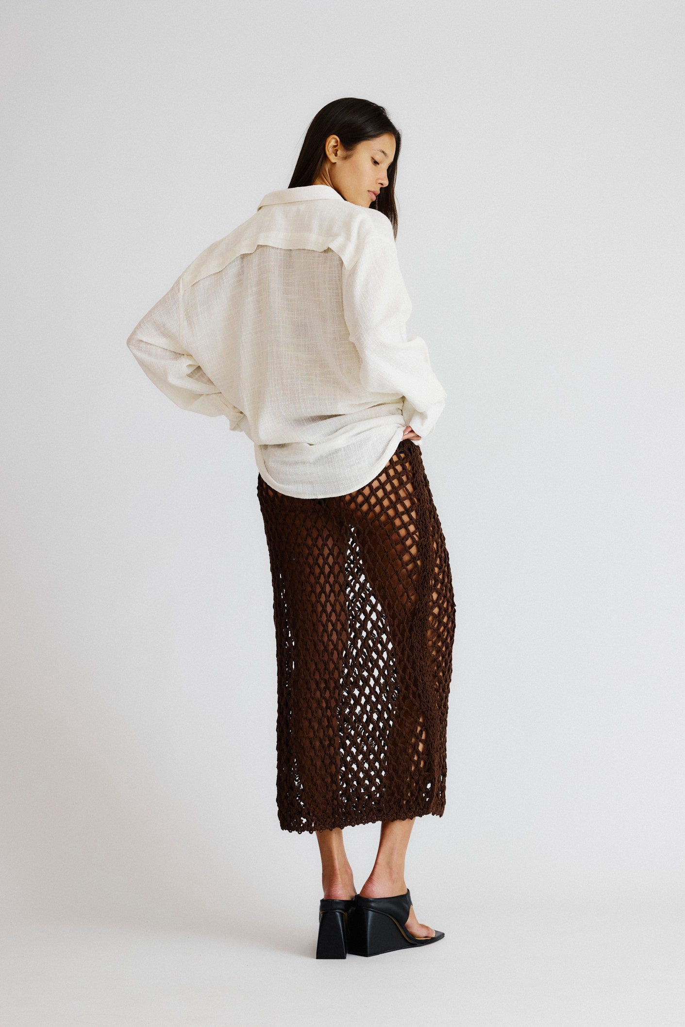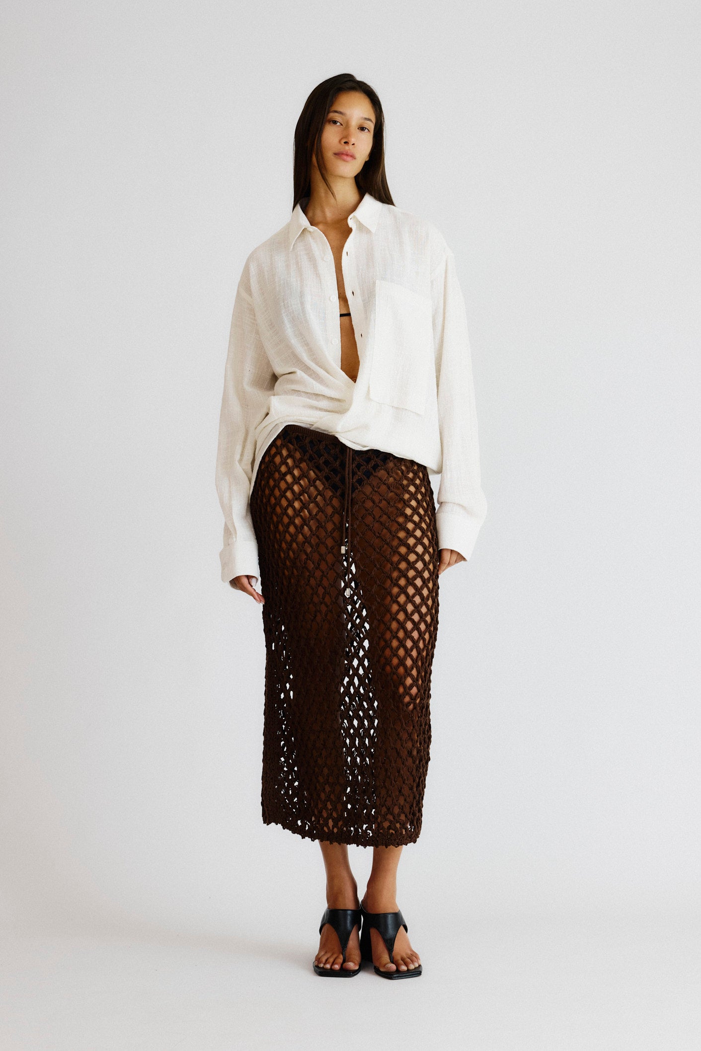 Saia em tricot com ponto aberto e comprimento midi. Possui cós com cordão para ajuste. A peça tem caimento leve, transparência natural e ajuste confortável ao corpo. Ideal como saída de praia ou para composições frescas em várias ocasiões
