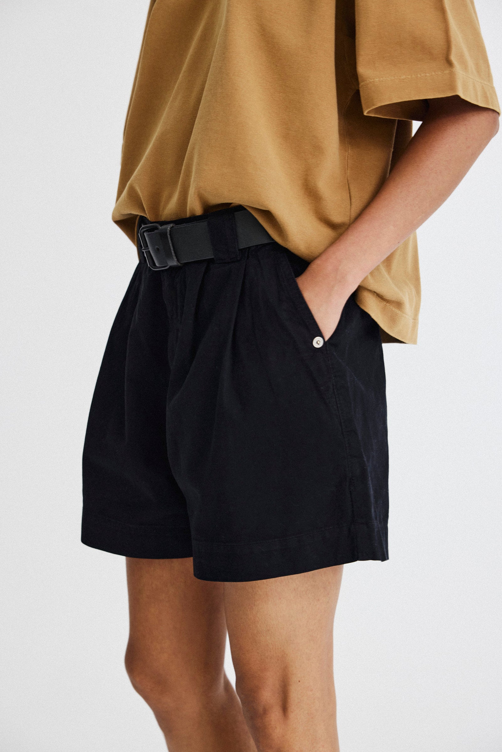 Shorts de sarja com pregas frontais. Possui bolsos laterais e bolsos embutidos na parte traseira. Cós com passantes e fechamento frontal por botão e zíper.