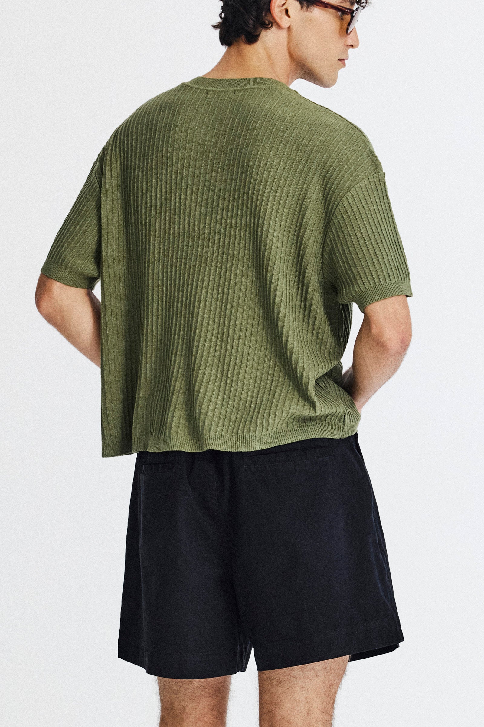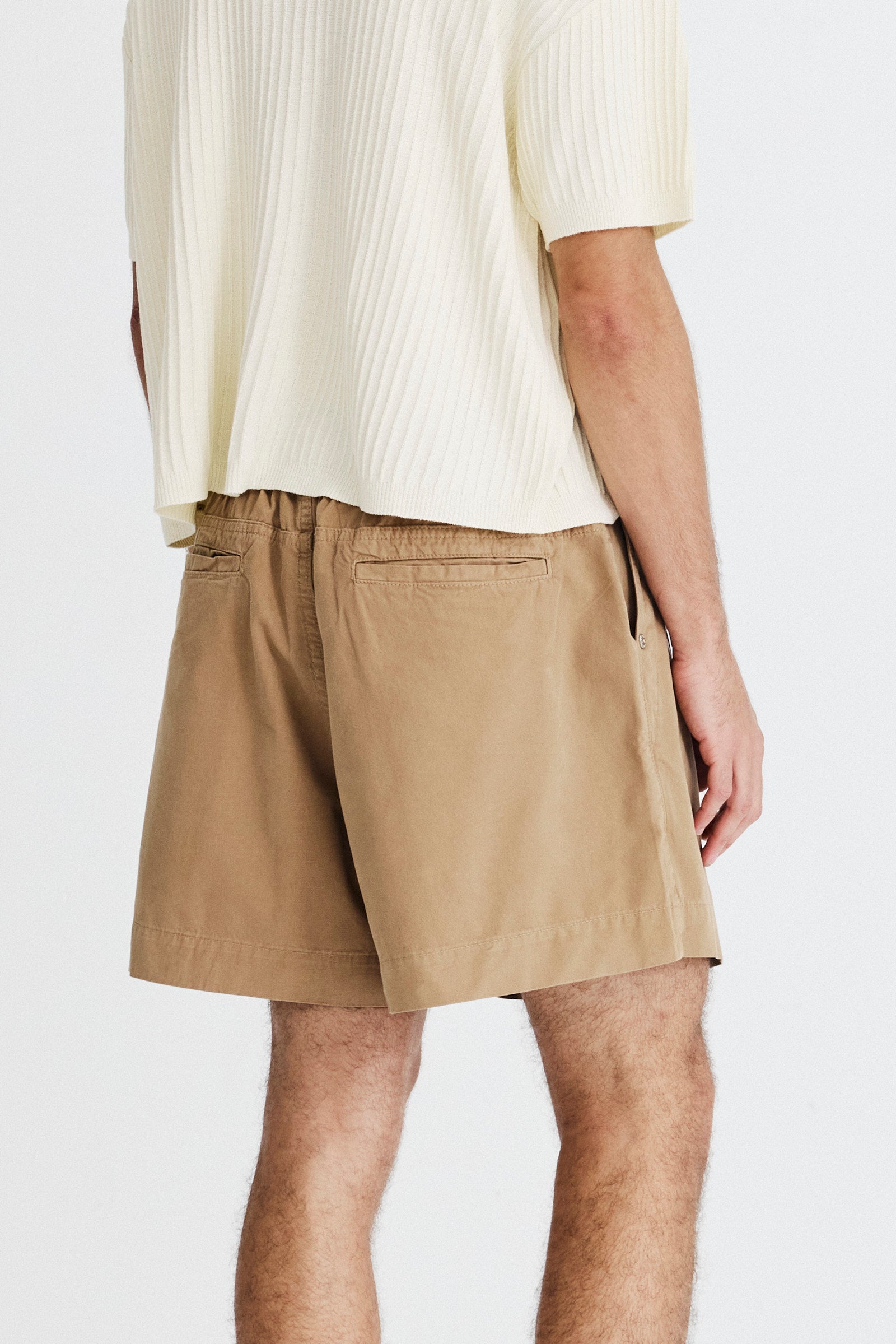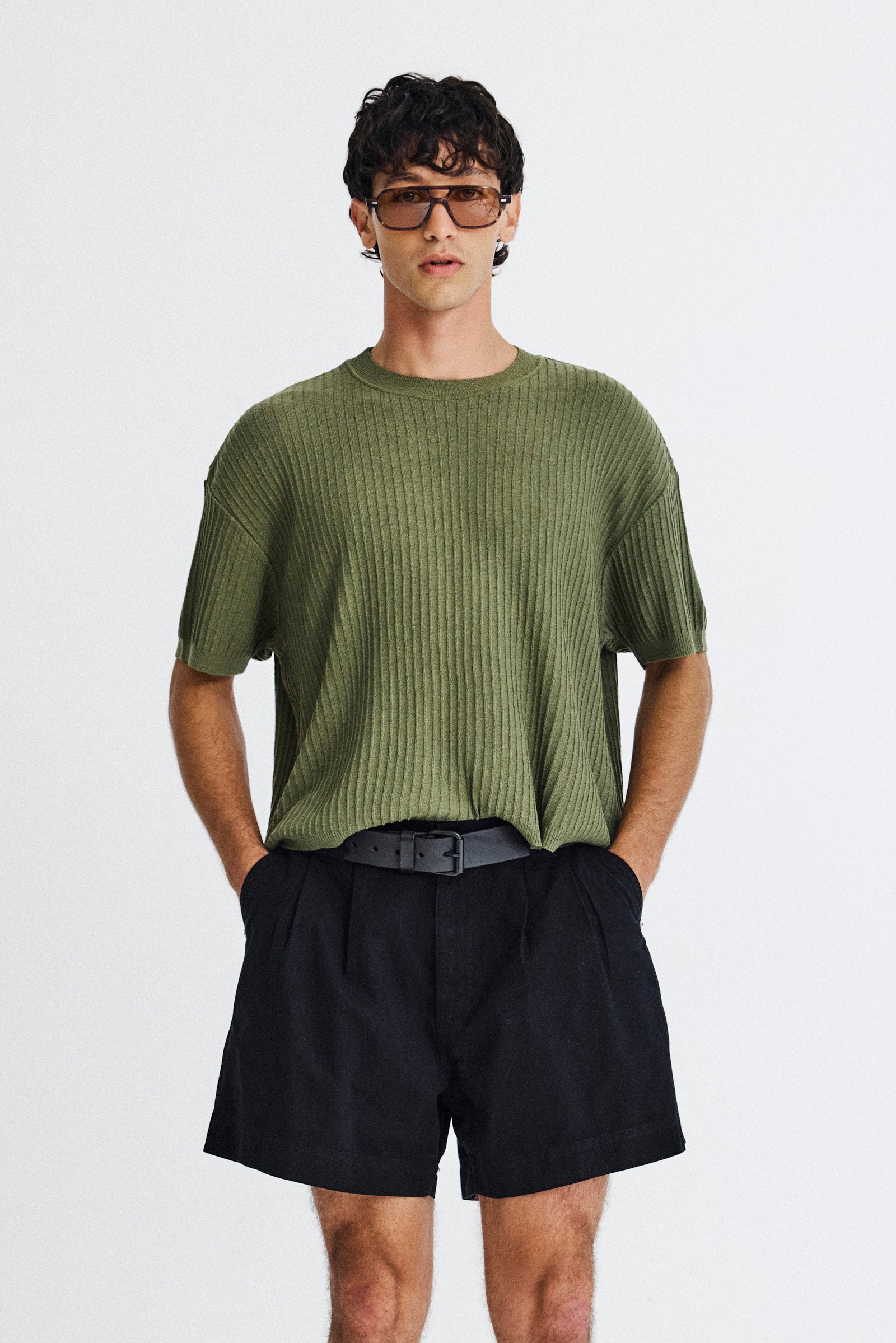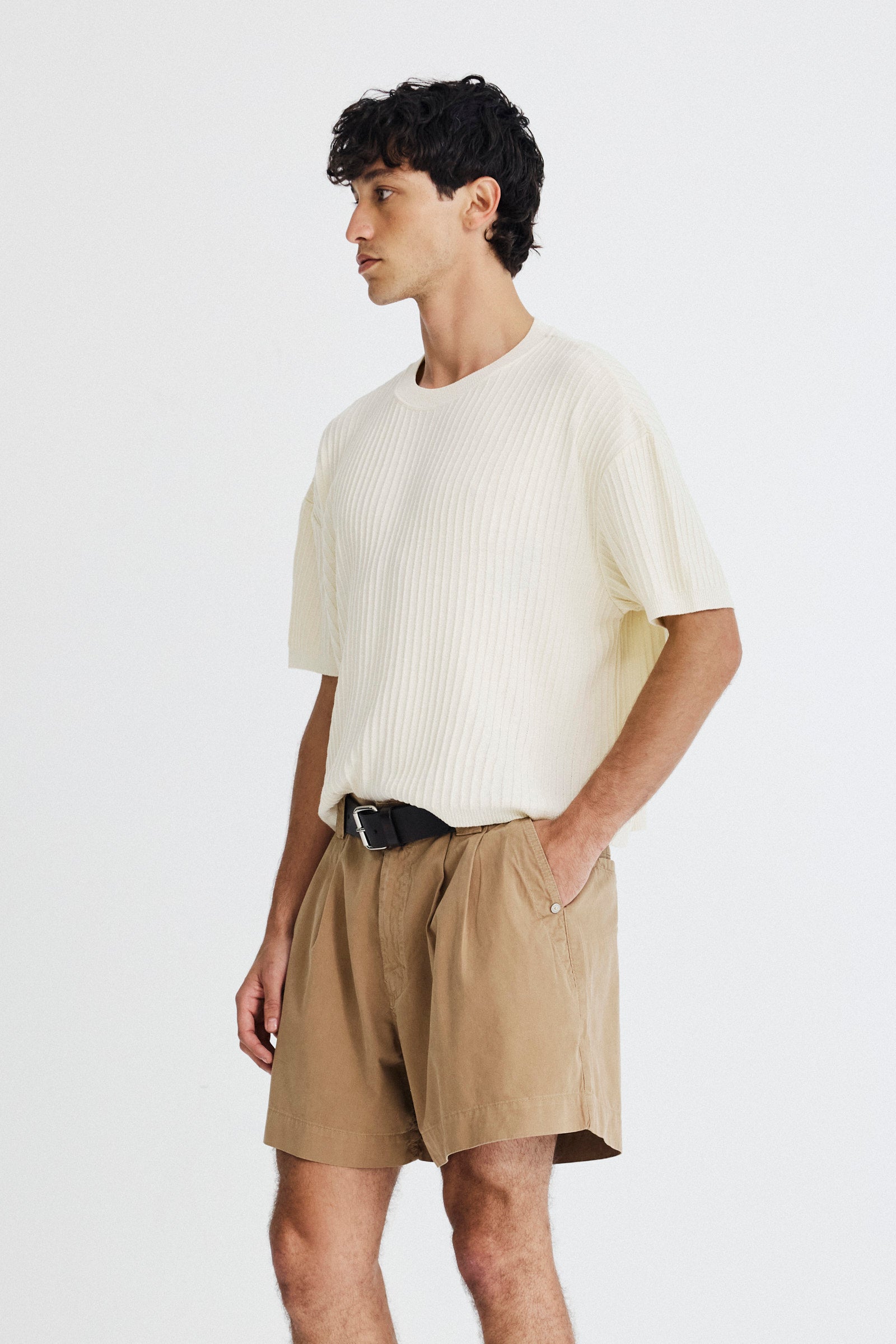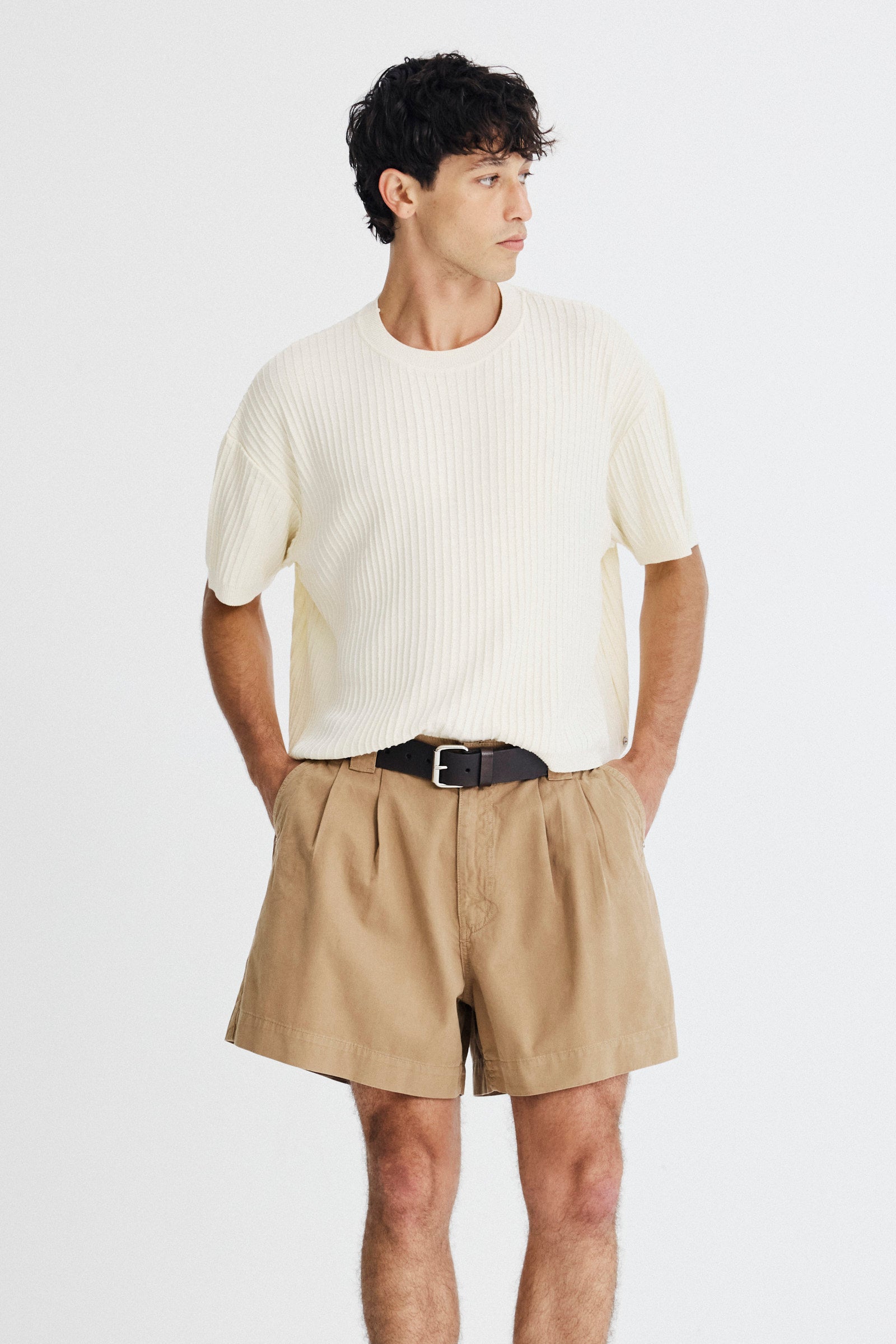 Shorts de sarja com pregas frontais. Possui bolsos laterais e bolsos embutidos na parte traseira. Cós com passantes e fechamento frontal por botão e zíper.