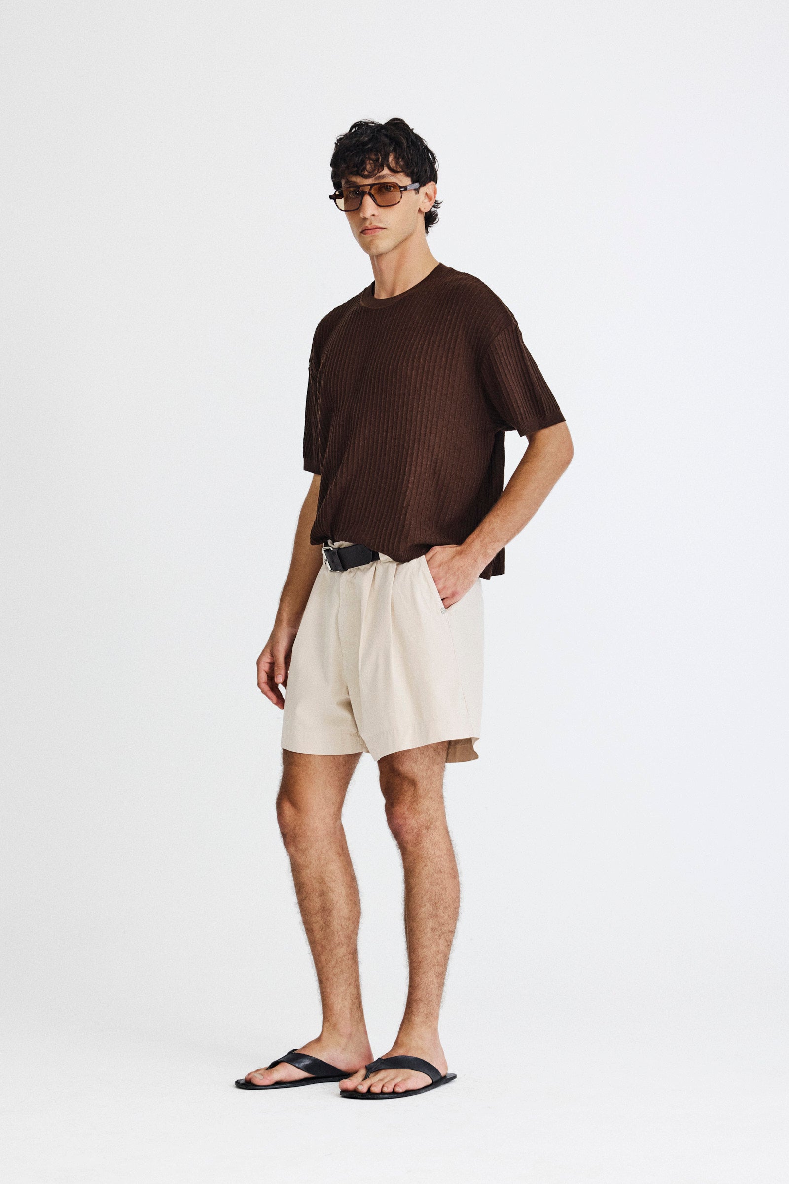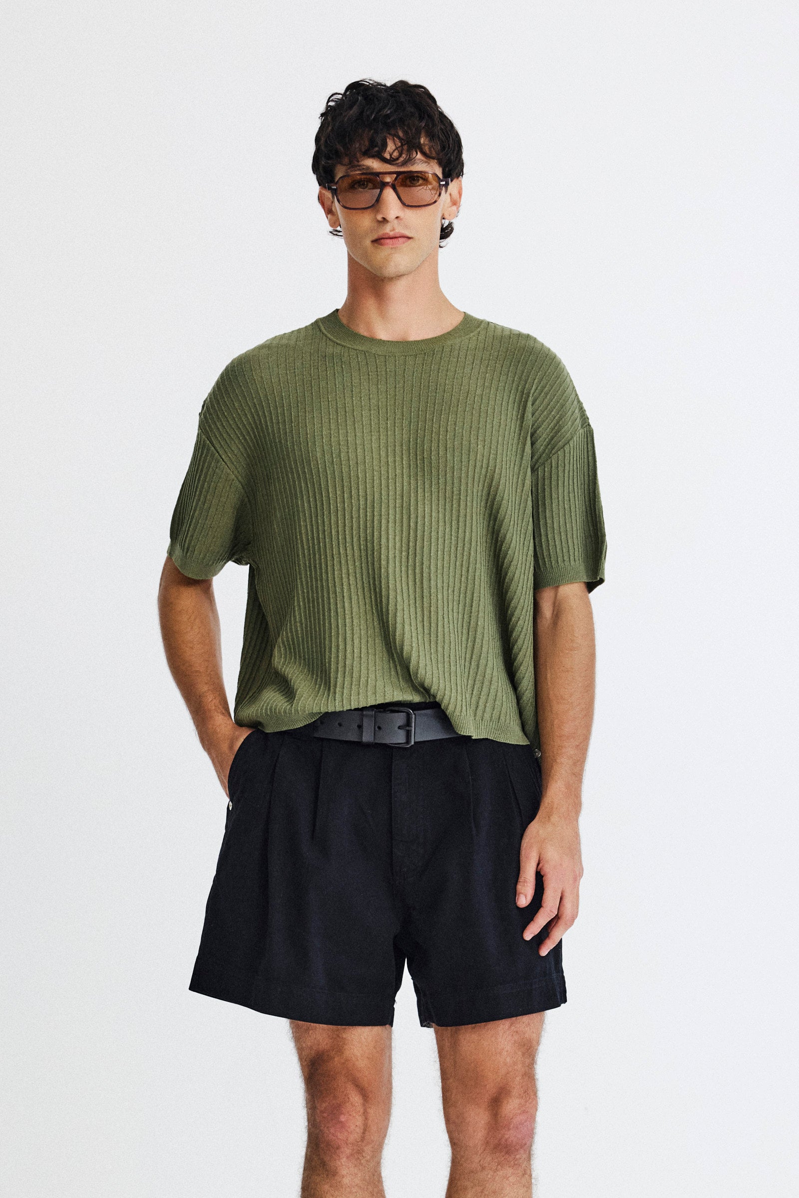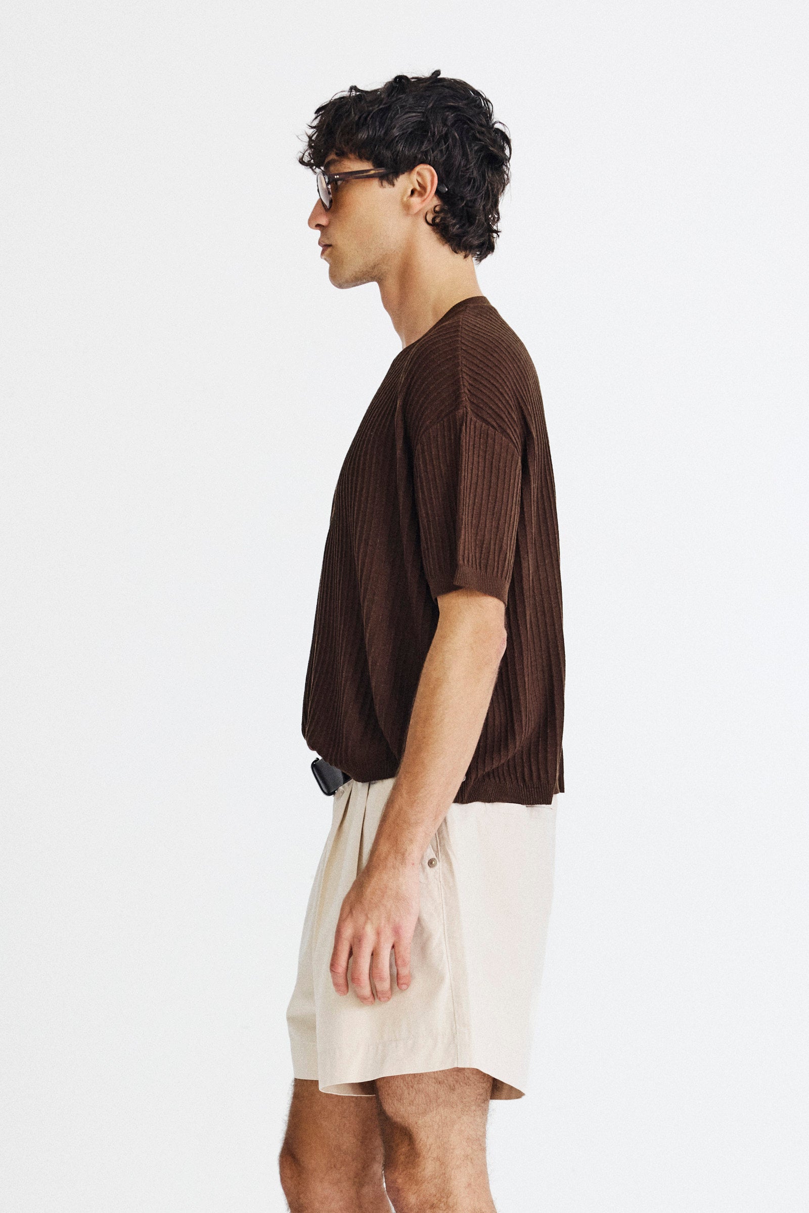 T-shirt com modelagem reta, comprimento levemente mais curto e textura canelada. O tricot tem toque macio e confortável, garantindo uso versátil em qualquer estação.