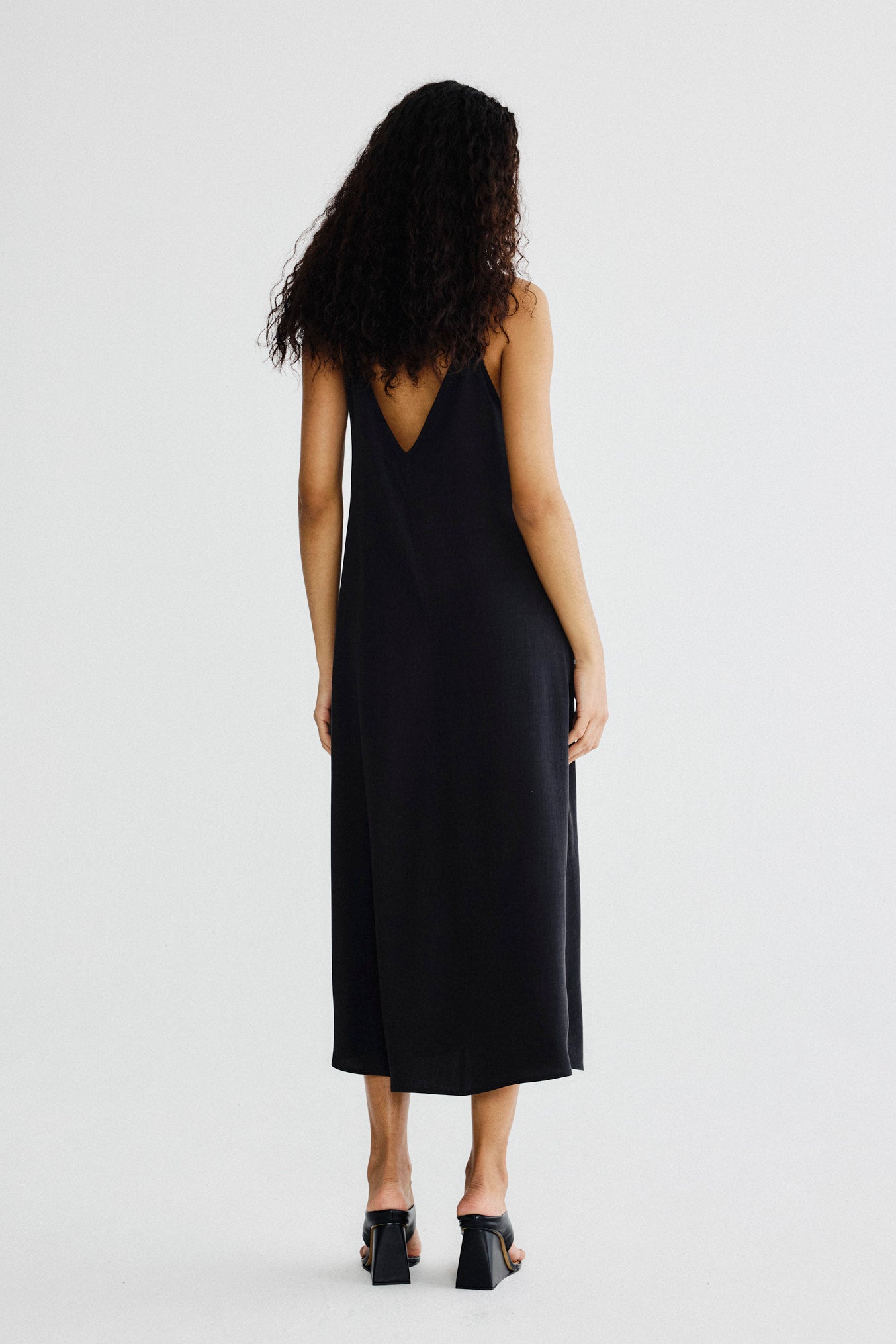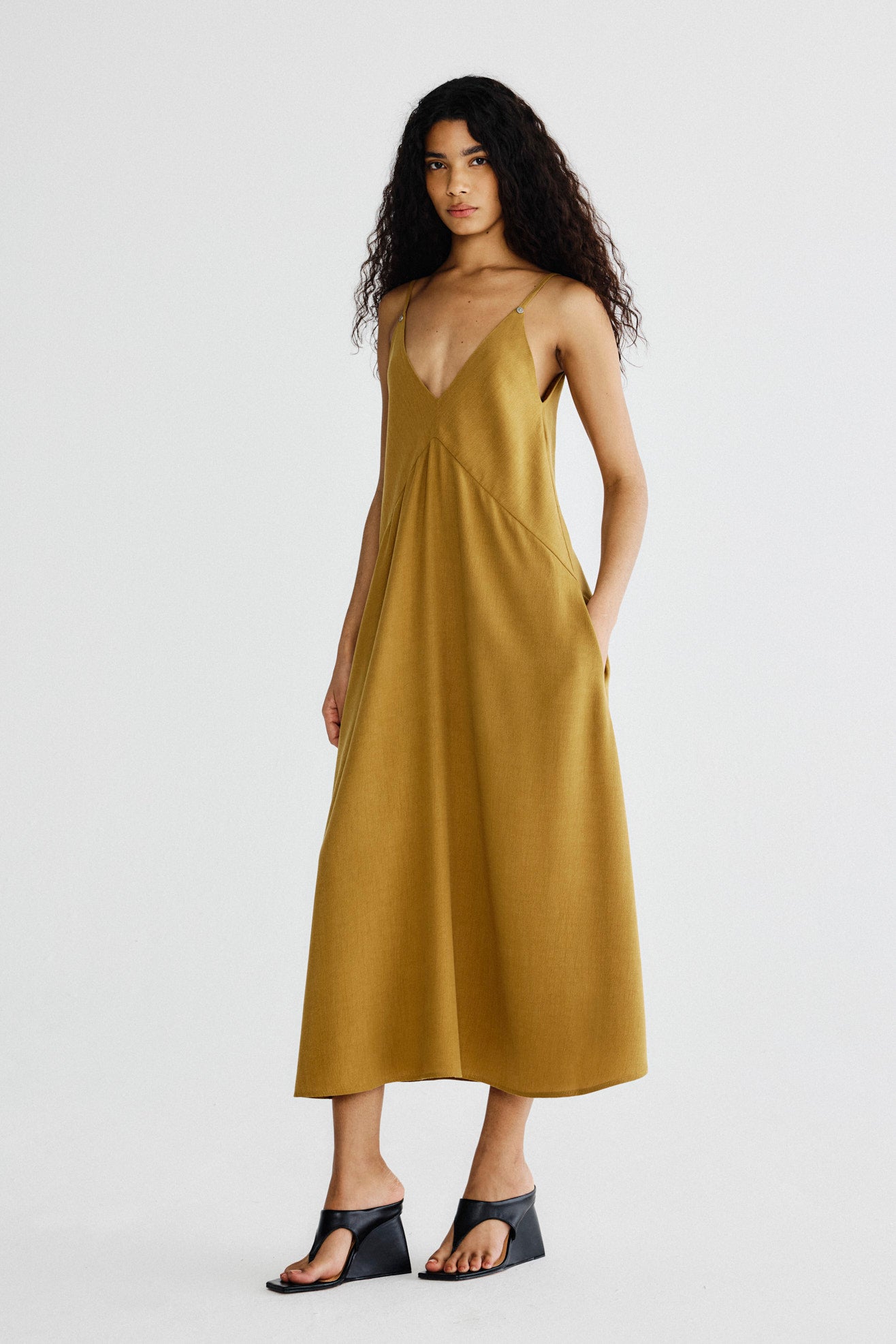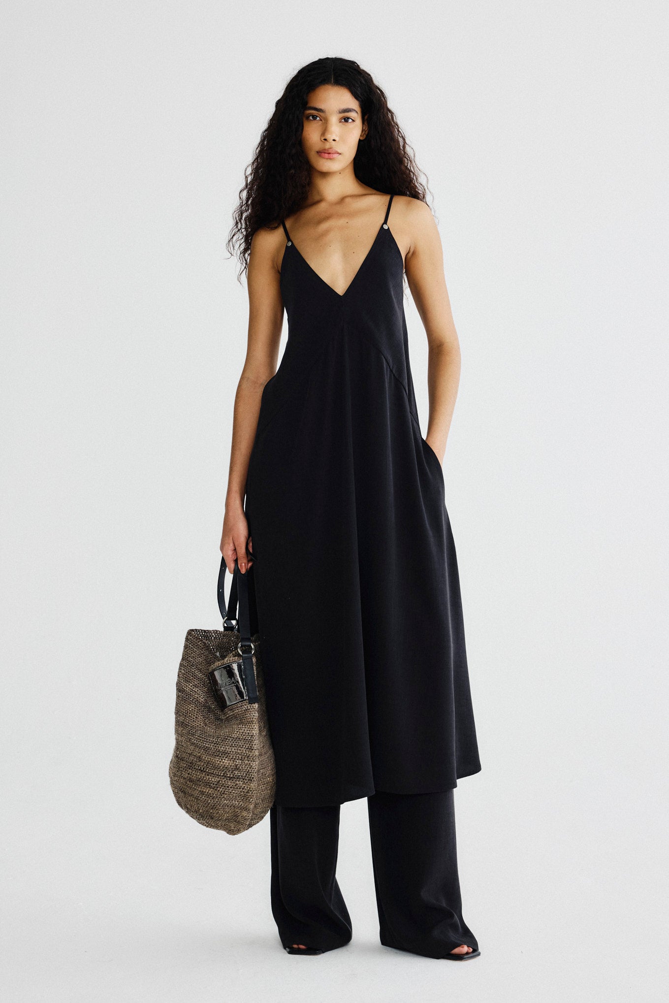 • Vestido longo em tecido leve e fluido, com caimento solto. O decote em V alonga a silhueta, enquanto as alças finas trazem delicadeza. Recortes sutis valorizam a modelagem, e os bolsos laterais trazem praticidade ao design minimalista.