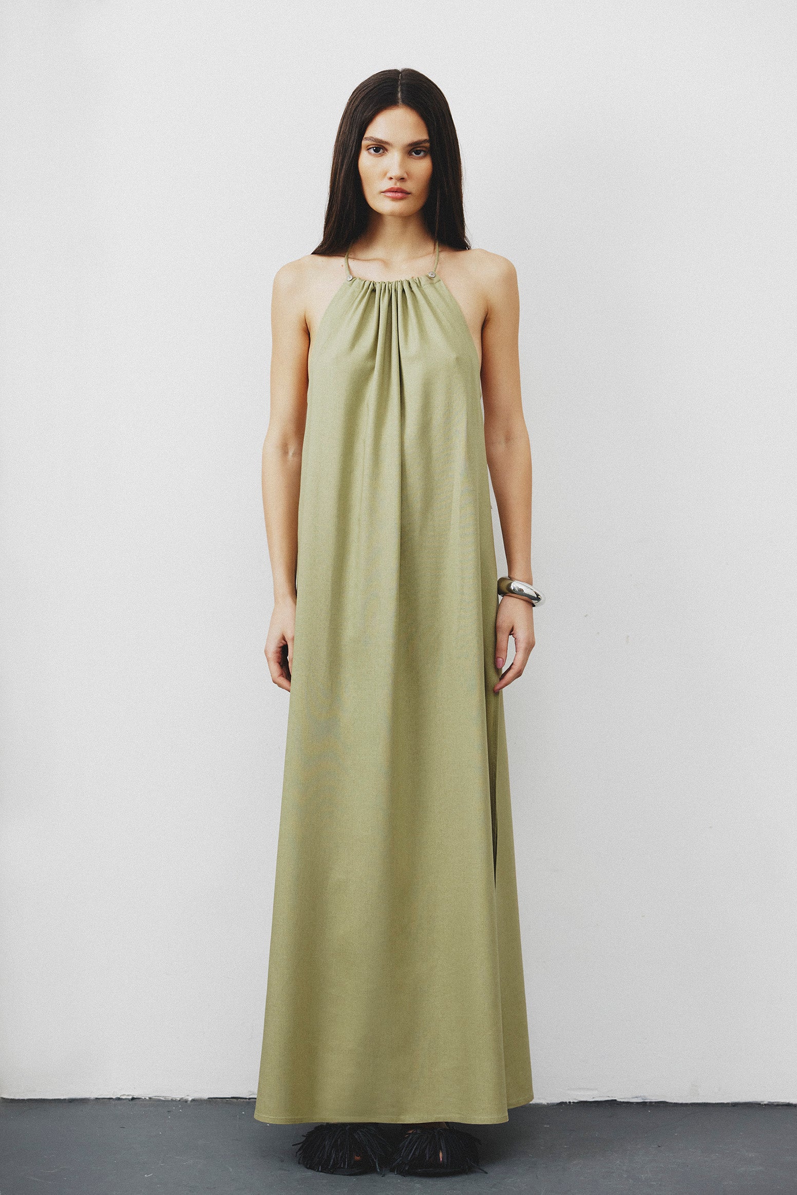 Vestido longo em tecido leve e estruturado, com decote halter e amarração no pescoço. Caimento solto, fendas laterais e modelagem fluida que garante movimento.